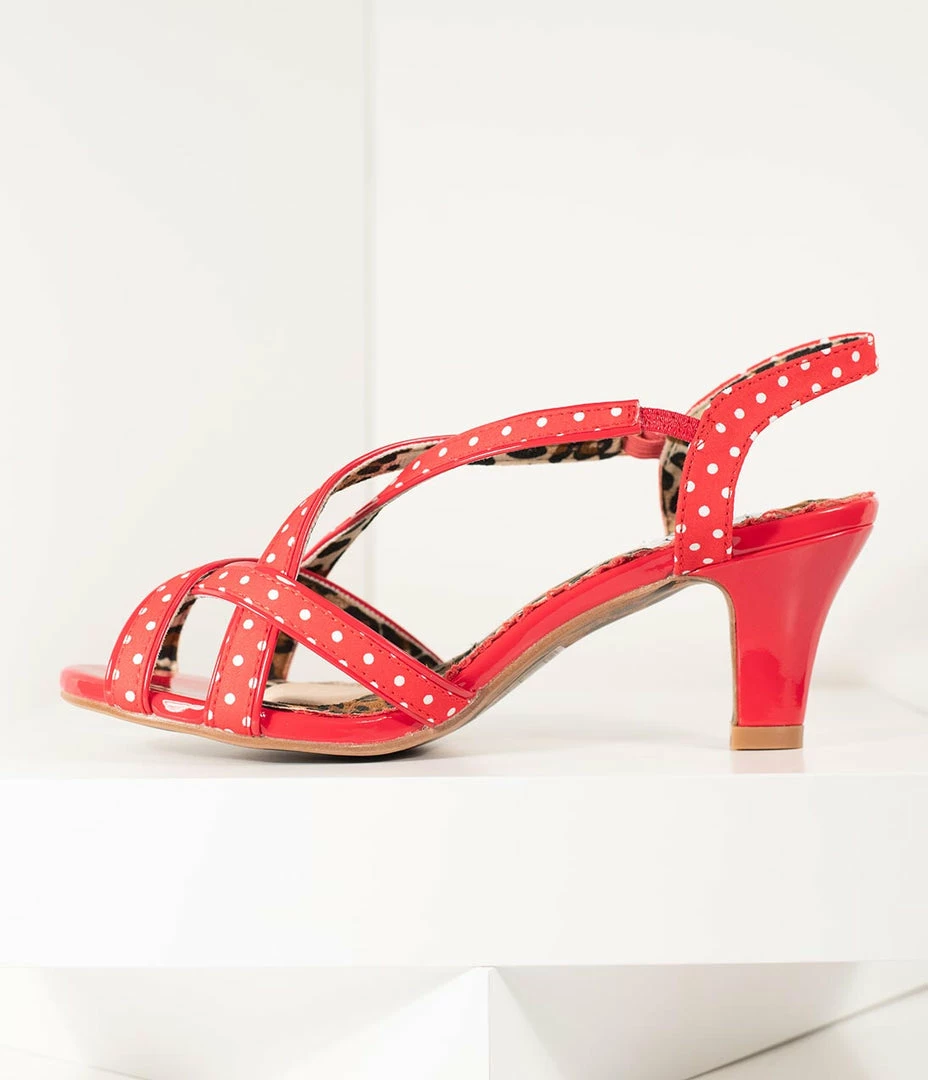 Take a tantalizing step towards dotted hints, darling! The Gracie heels are a retro revolution in fabulous red and dance with white polka dots. Crafted from a lovely textile and patent leatherette, a striking design of criss crossing straps, these dainty peep toe kicks are secured with gored and adjustable ankle strap while the darling 3โ heel provides a flattering lift. Outfitted with a cushioned leopard print insole to complete any enticing ensemble!ย