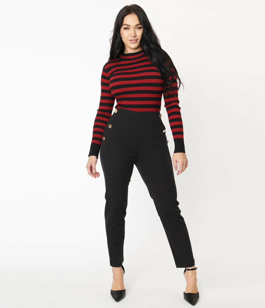 Swagger like you own the place, dames! These chic black pants are crafted in a sturdy woven fabric and features a straight leg design while the banded waist is cinched with a back elastic band. The functional side pockets are accented with golden faux buttons, embellished with anchors and complete with faux back pockets for retro styling!