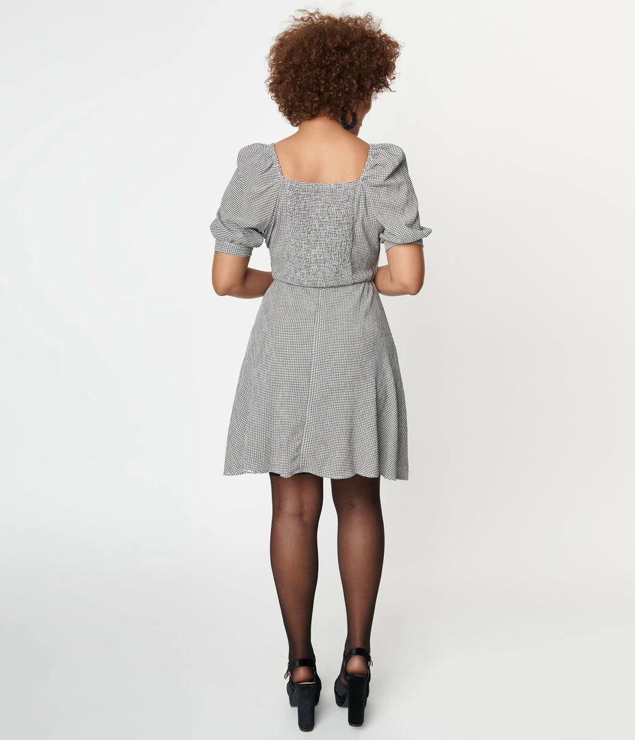 Not your average picnic piece, darling! This charming fit and flare is crafted in a stretchy knit and dances with a black and white gingham pattern throughout. The sultry surplice neckline is embellished with gentle ruching and framed by lovely short sleeves that drop into a banded cuff. The elastic waist and smocked back panel lend a flattering fit while the flirtatious flare skirt dances high above the knees!