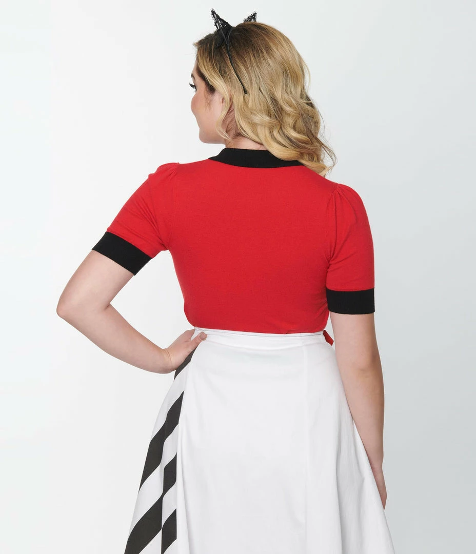 This cheeky knit top, in collaboration with Emily the Strange, is crafted in a bold red knit, accented with black on the short sleeve cuffs, hem, and partial button up placket. Complete with an embroidered patch on the chest of Emily and her cats..