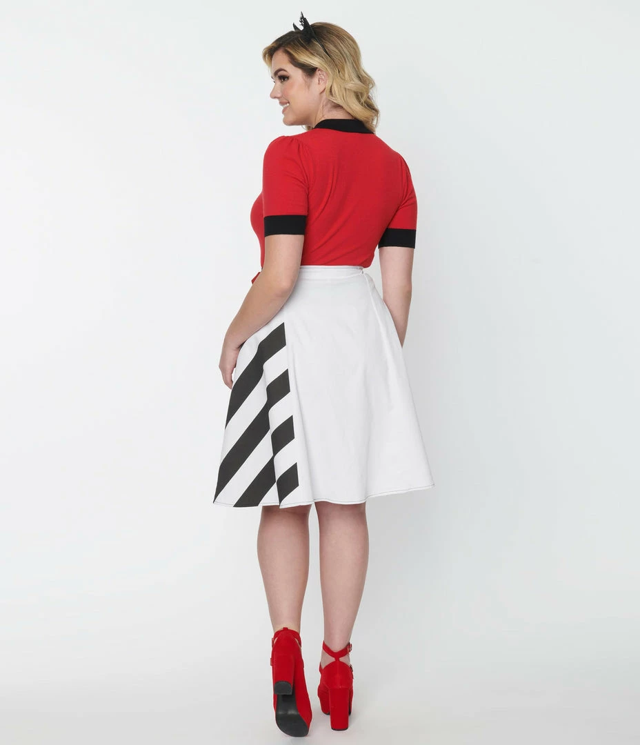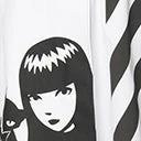 This eye-catching and iconic swing skirt in collaboration with Emily the Strange is crafted in woven stretch fabric that features a black screen print of Emily, her cats, and bold stripes throughout the white backdrop. Outfitted with an attached buckle belt and waist buttons for a secure wrap design.