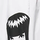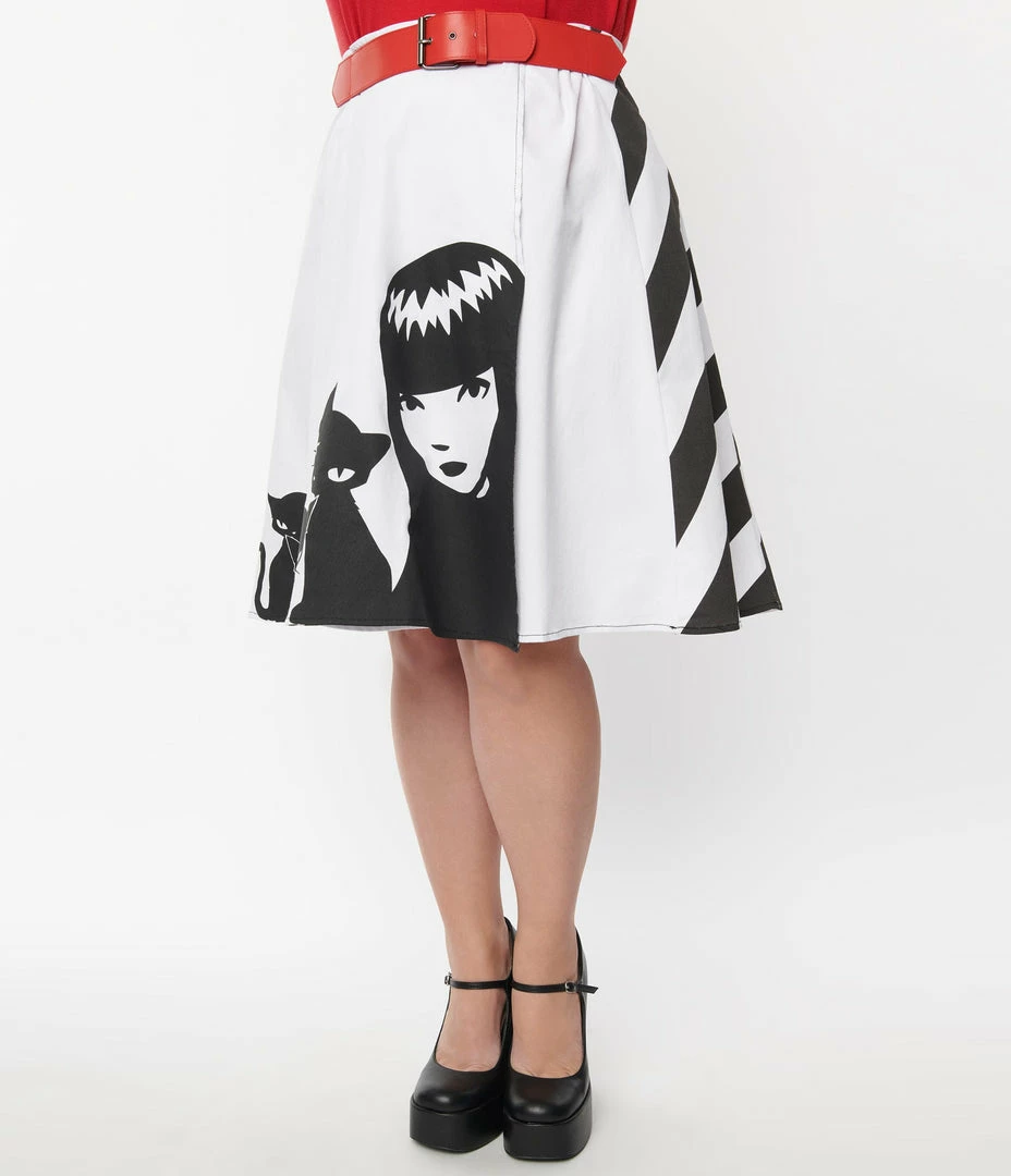 This eye-catching and iconic swing skirt in collaboration with Emily the Strange is crafted in woven stretch fabric that features a black screen print of Emily, her cats, and bold stripes throughout the white backdrop. Outfitted with an attached buckle belt and waist buttons for a secure wrap design.