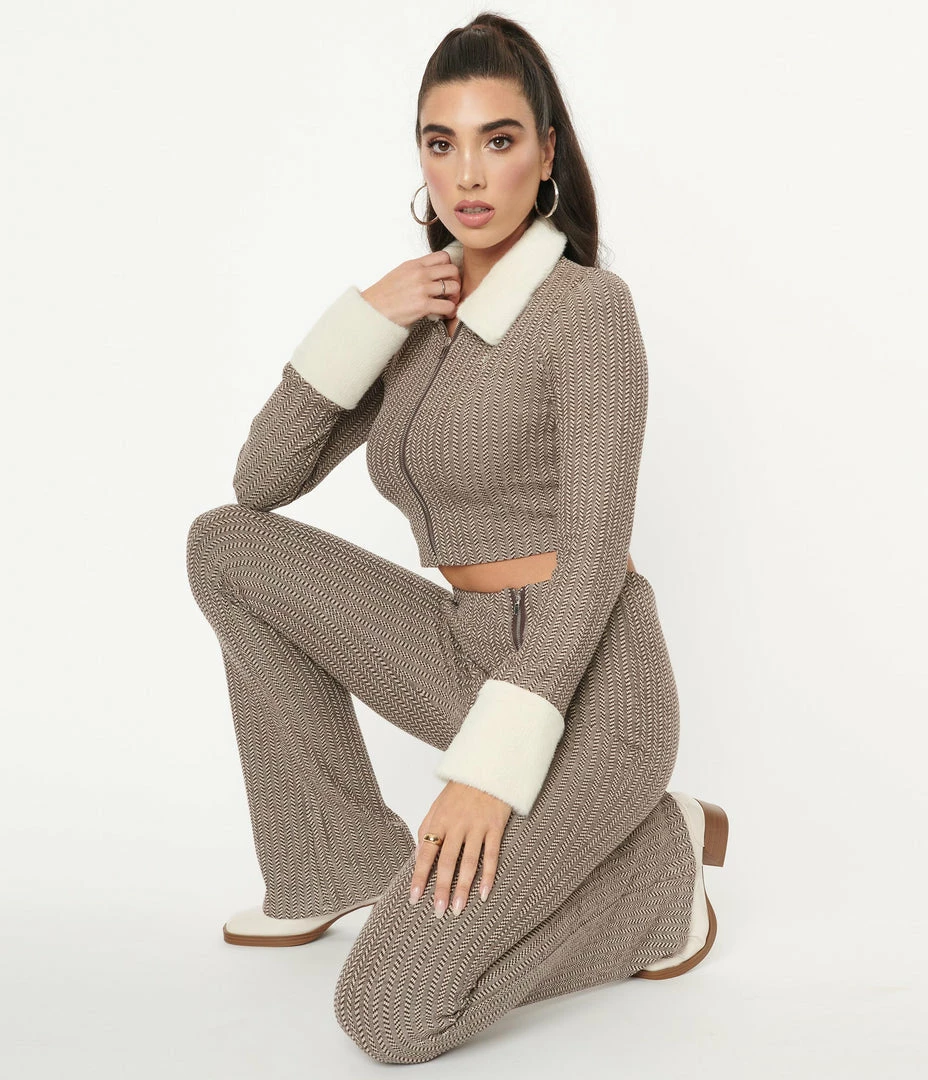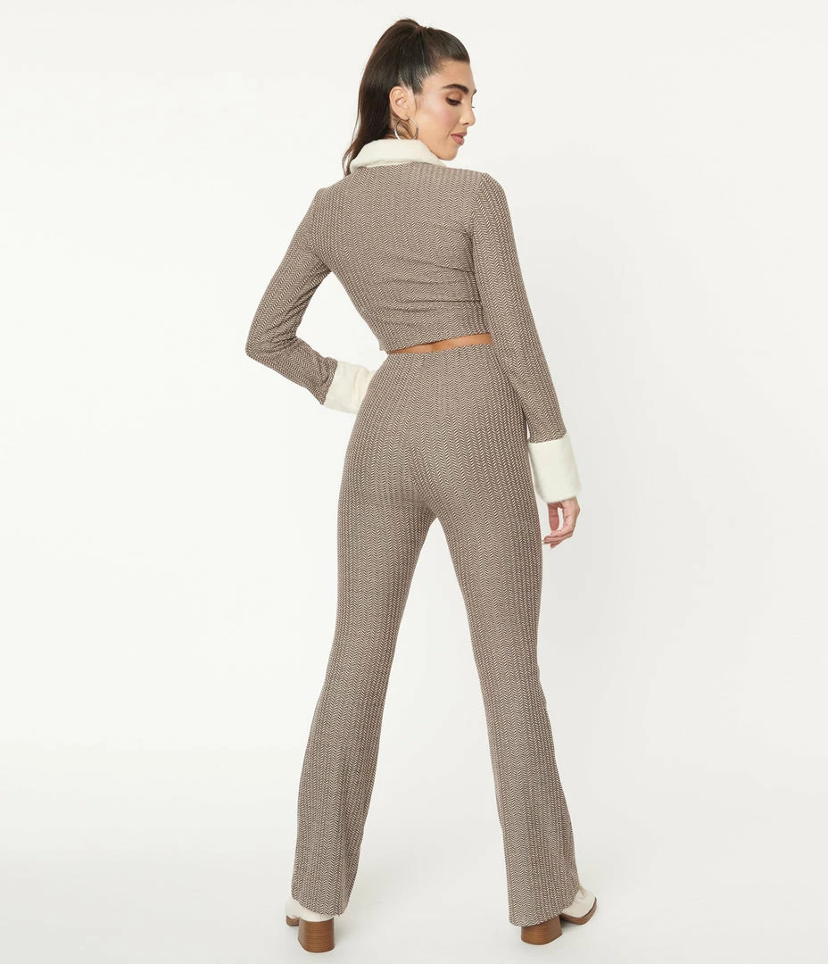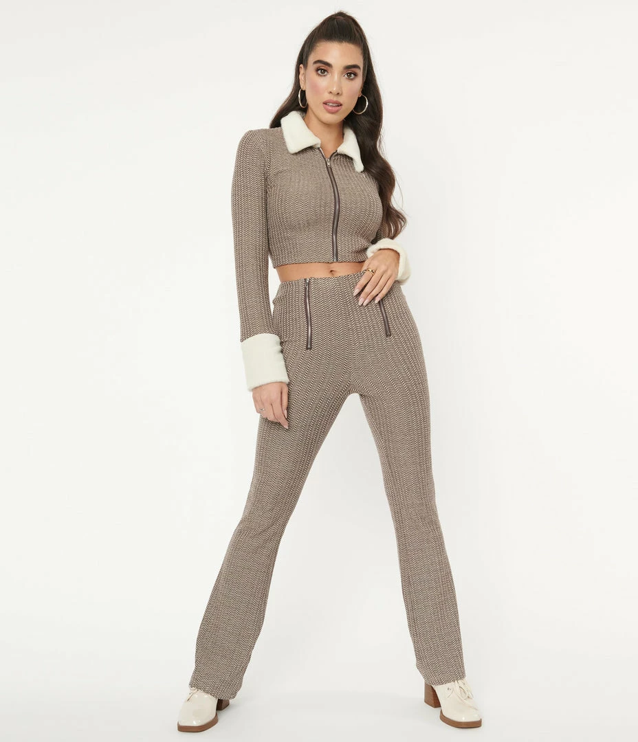 Keep the cold at bay, dames! These marvelous pants are crafted in a fabulous stretch knit that boasts a beautiful brown herringbone and striped pattern throughout. The elastic banded waist nips in your figure while dual faux zippers lend a charming embellishment while the legs drop into a lovely flare!