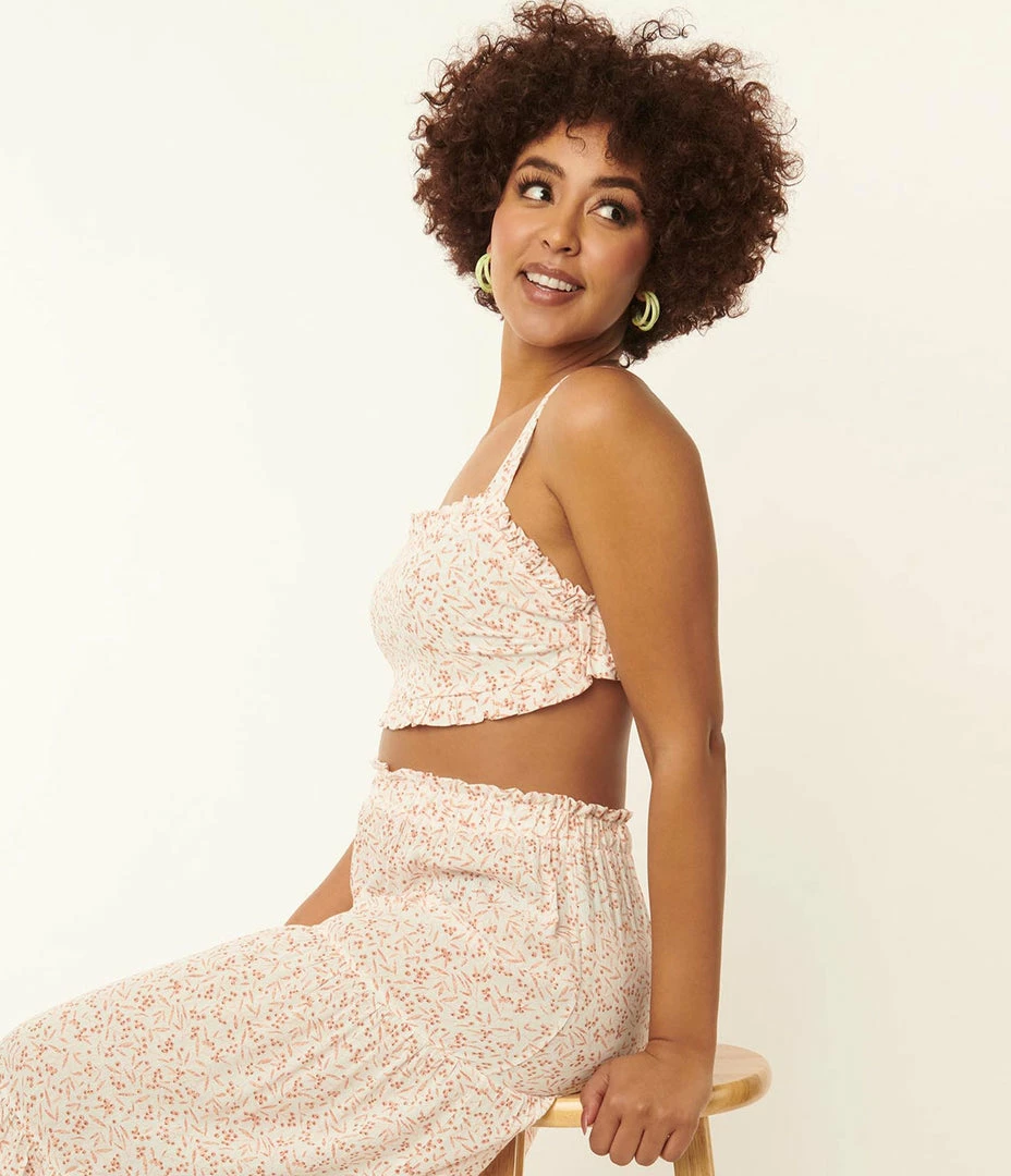 This sultry crop top is crafted in a lightweight woven crepe that features coral pink berries printed throughout the ivory white backdrop. The sweetheart neckline is supported by shoulder straps and a back elastic band.