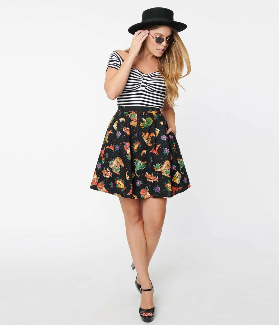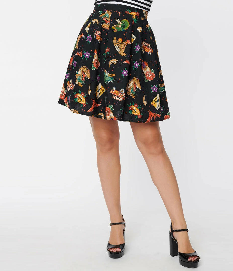 Simply a-roar-able, darling! Cast in a sturdy black cotton, this sweet skater skirt from Dangerfield features a marvelous prehistoric dinosaur motif print in a vintage tattoo style. The banded waist is cinched with back zipper and button, while the knife pleated flare skirt is outfitted with side pockets for adorable function!