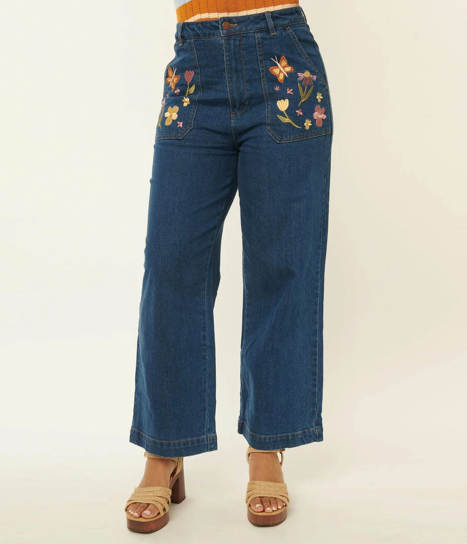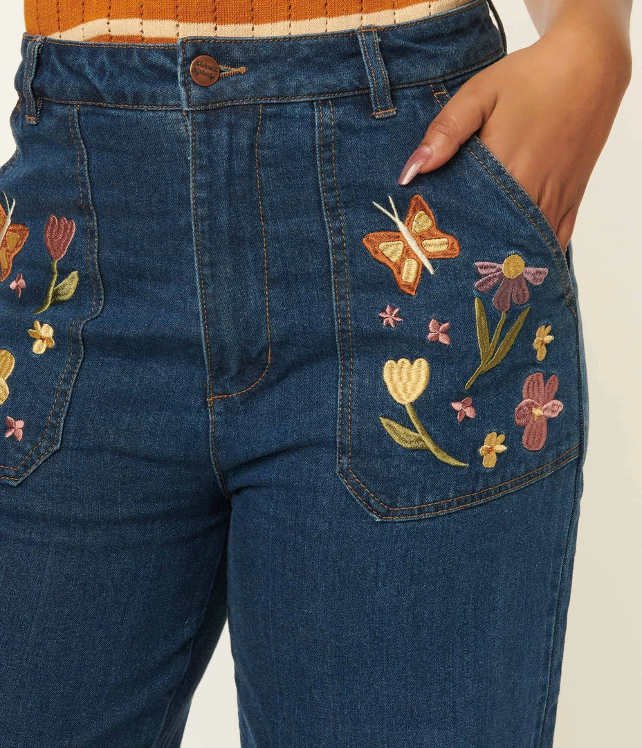 Outlet 🤩 Factory X (Princess Highway) Blue Denim Embroidered Floral 👖 Jeans 👏