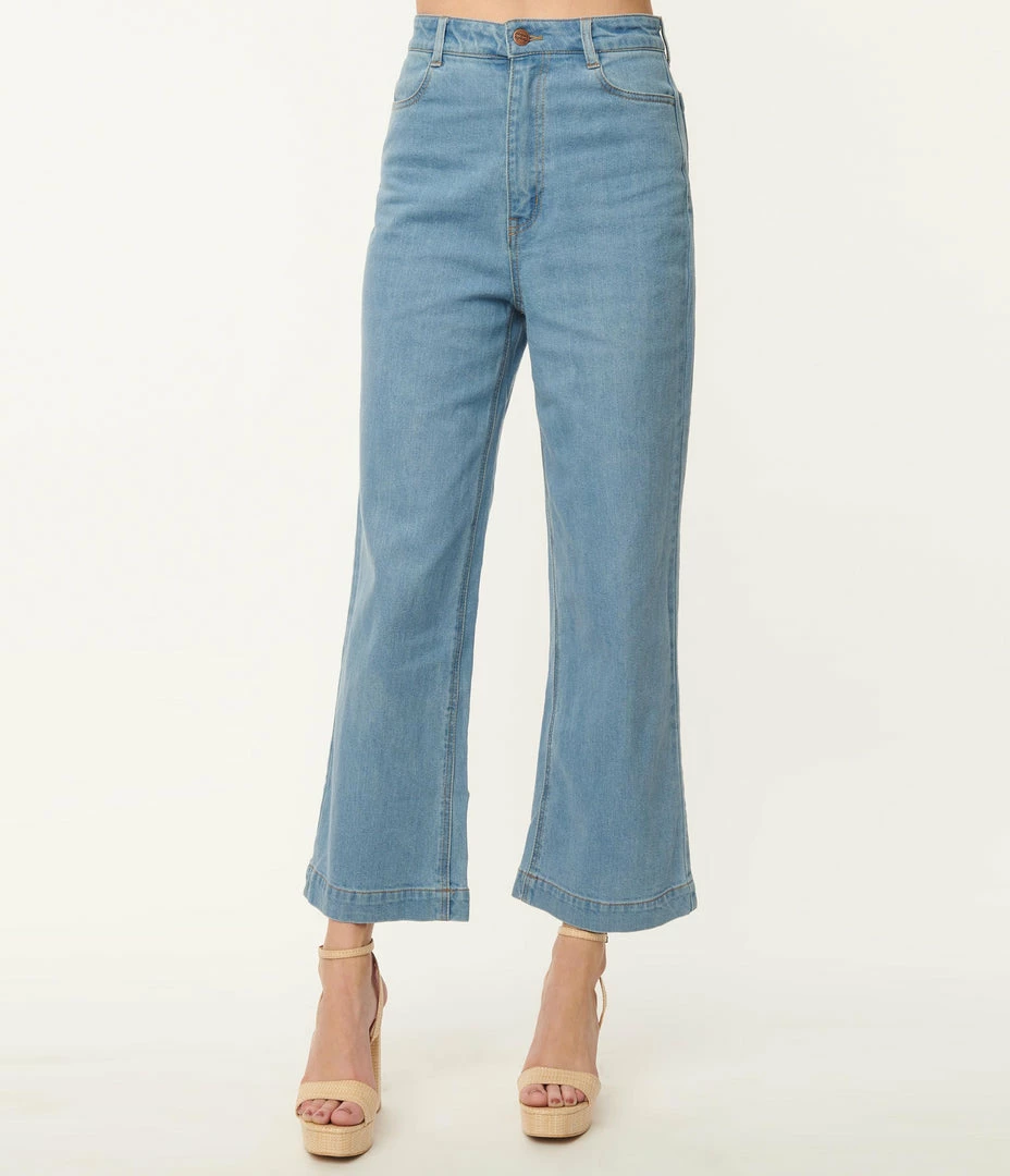 A cute pair of jeans crafted in a sturdy light blue cotton. The cropped straight legs are secured with a front zipper and button and complete with front and back pockets.