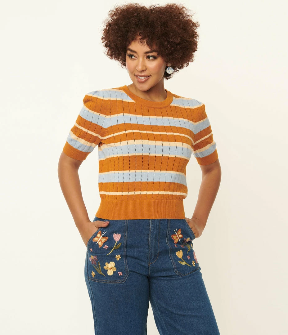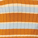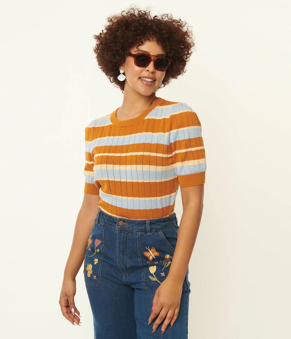 This sweet top is crafted in cotton knit and features light blue, beige, and saffron brown stripes throughout the perforated silhouette. Framed with short sleeves, centered by a scoop neckline, and complete with a stay-in-place hem.