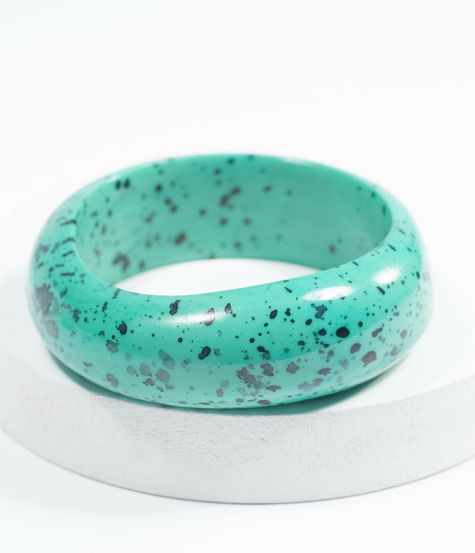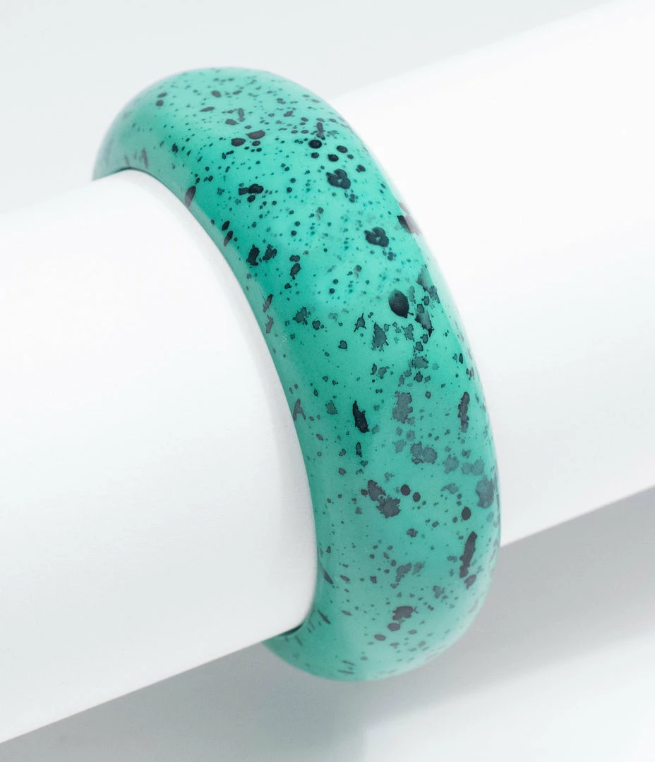 This turquoise green resin bangle with black specs throughout has a fun retro bakelite feel in a modern organic shape.