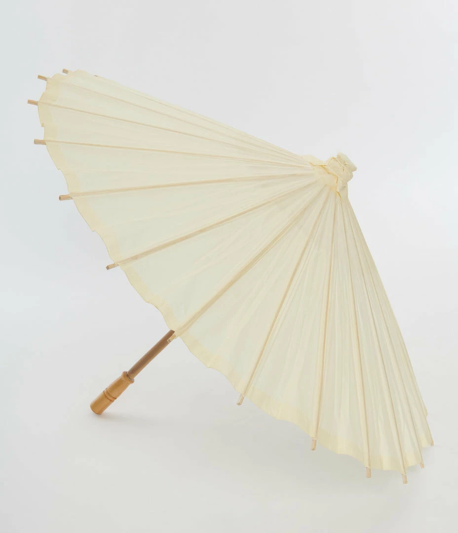 The ivory paper parasol is a fun vintage style decoration for any celebration. Its paper canopy, wooden bamboo handle, and bamboo ribbing make it lightweight for even the hottest days.