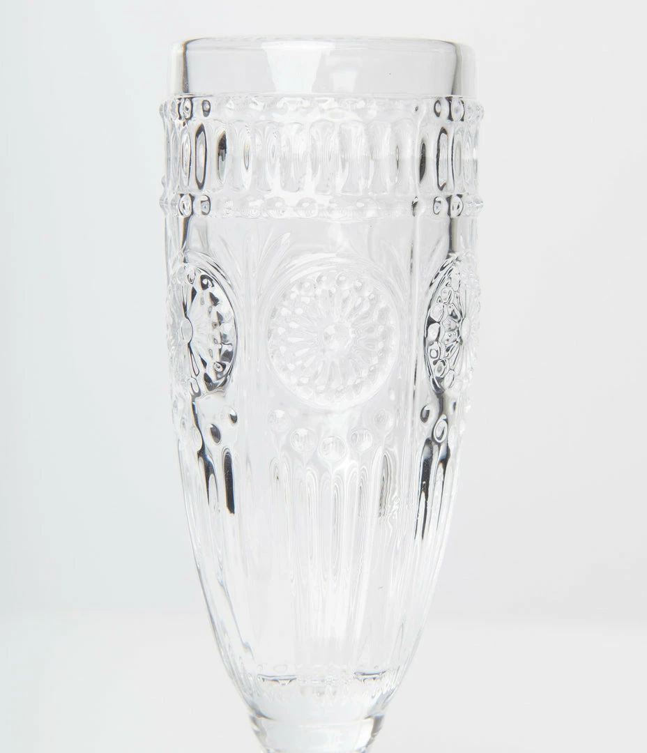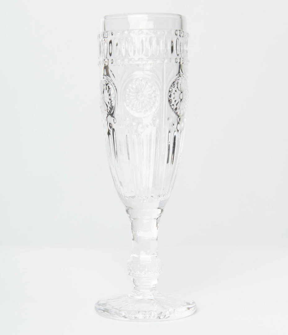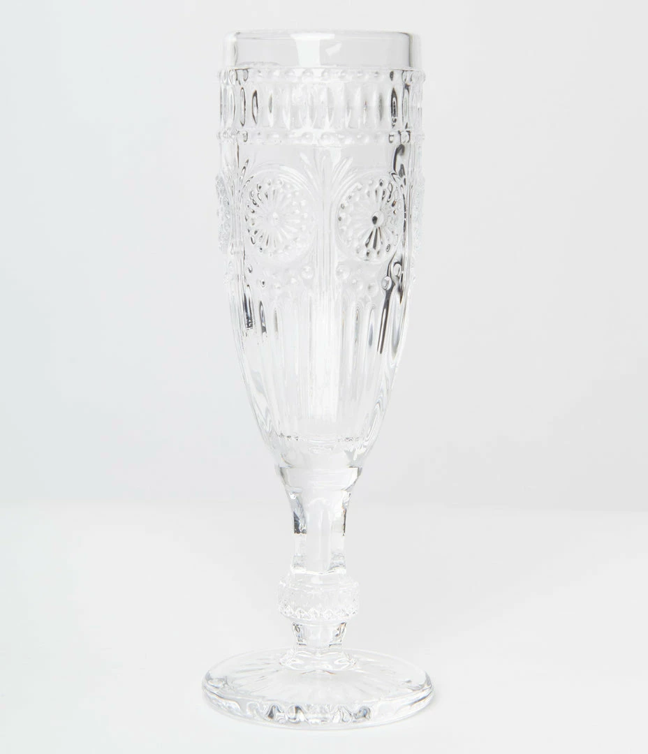 Complement your vintage style with this gorgeous clear pressed glass champagne flute. Pairs perfectly with special occasions and weekend mimosas!