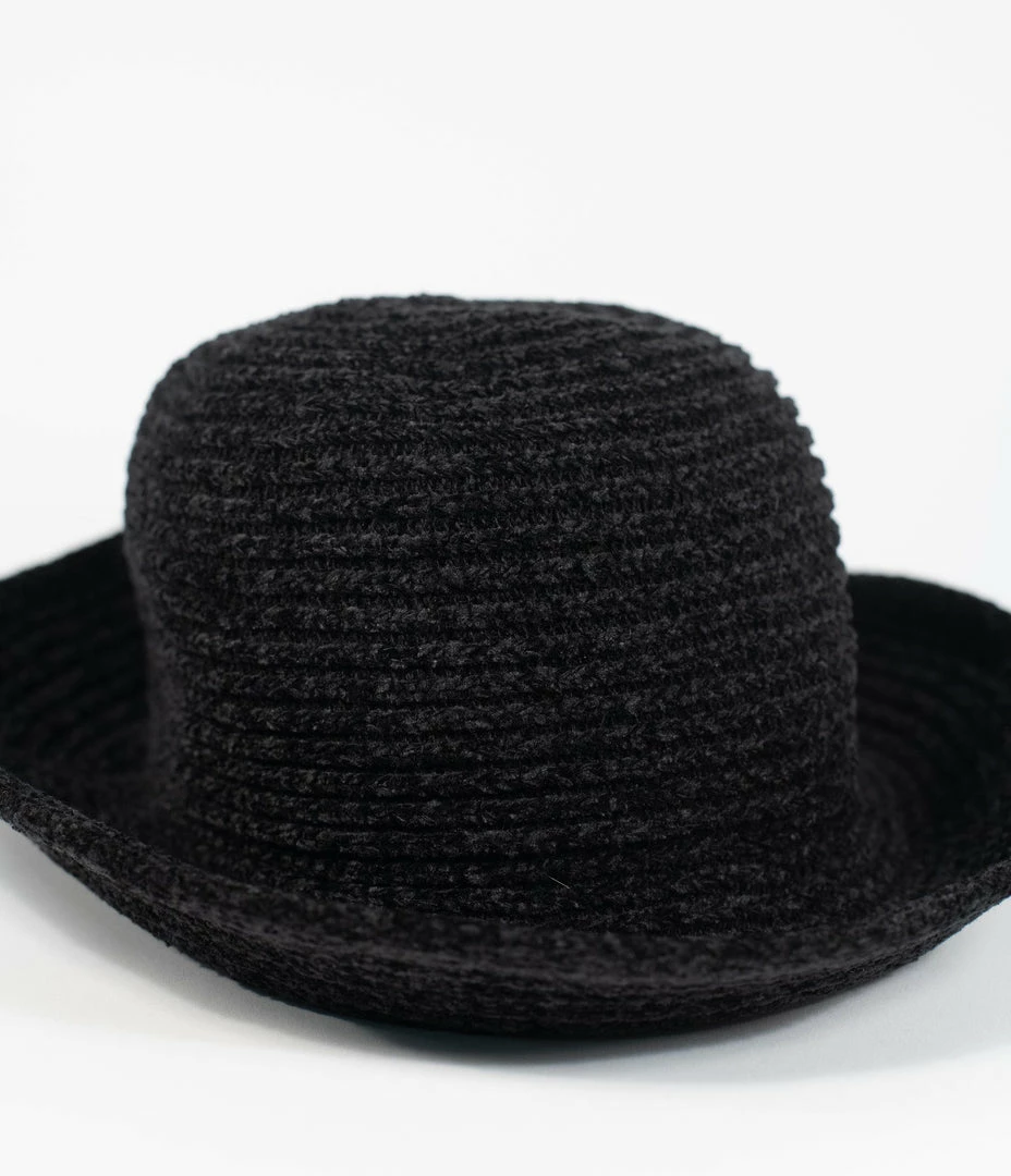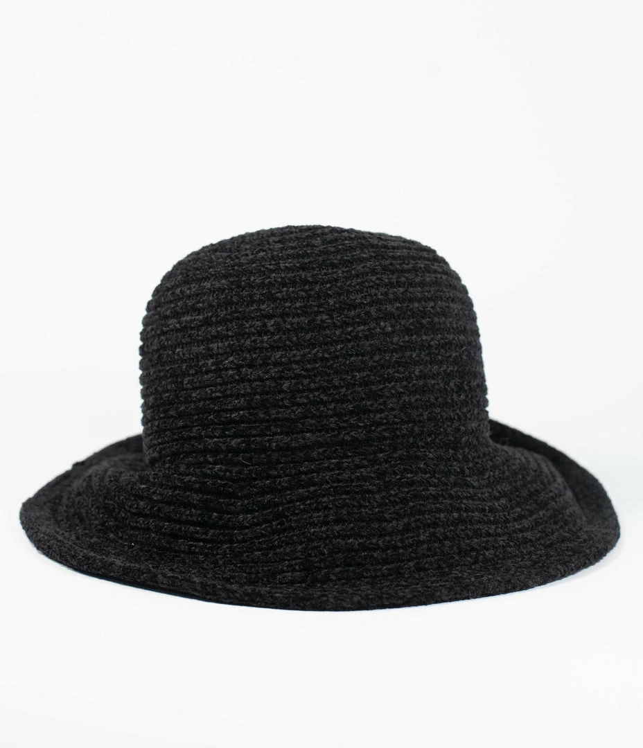 Playfully stylish and comfortable! This retro style bucket hat is crafted in a fun fuzzy black fabric and features a wire edge brim so you can wear it upturned or down turned. The inner grosgrain ribbon and adjustable ties provide all day comfort.