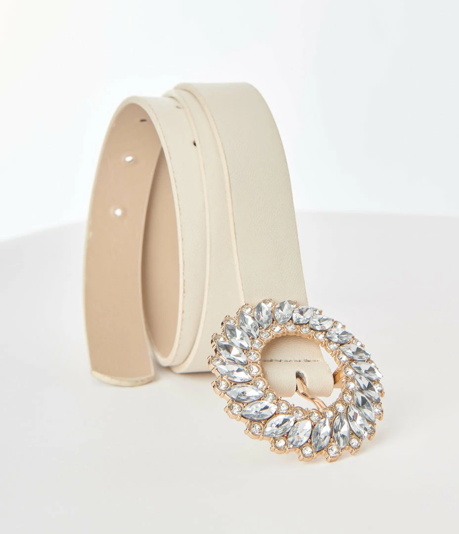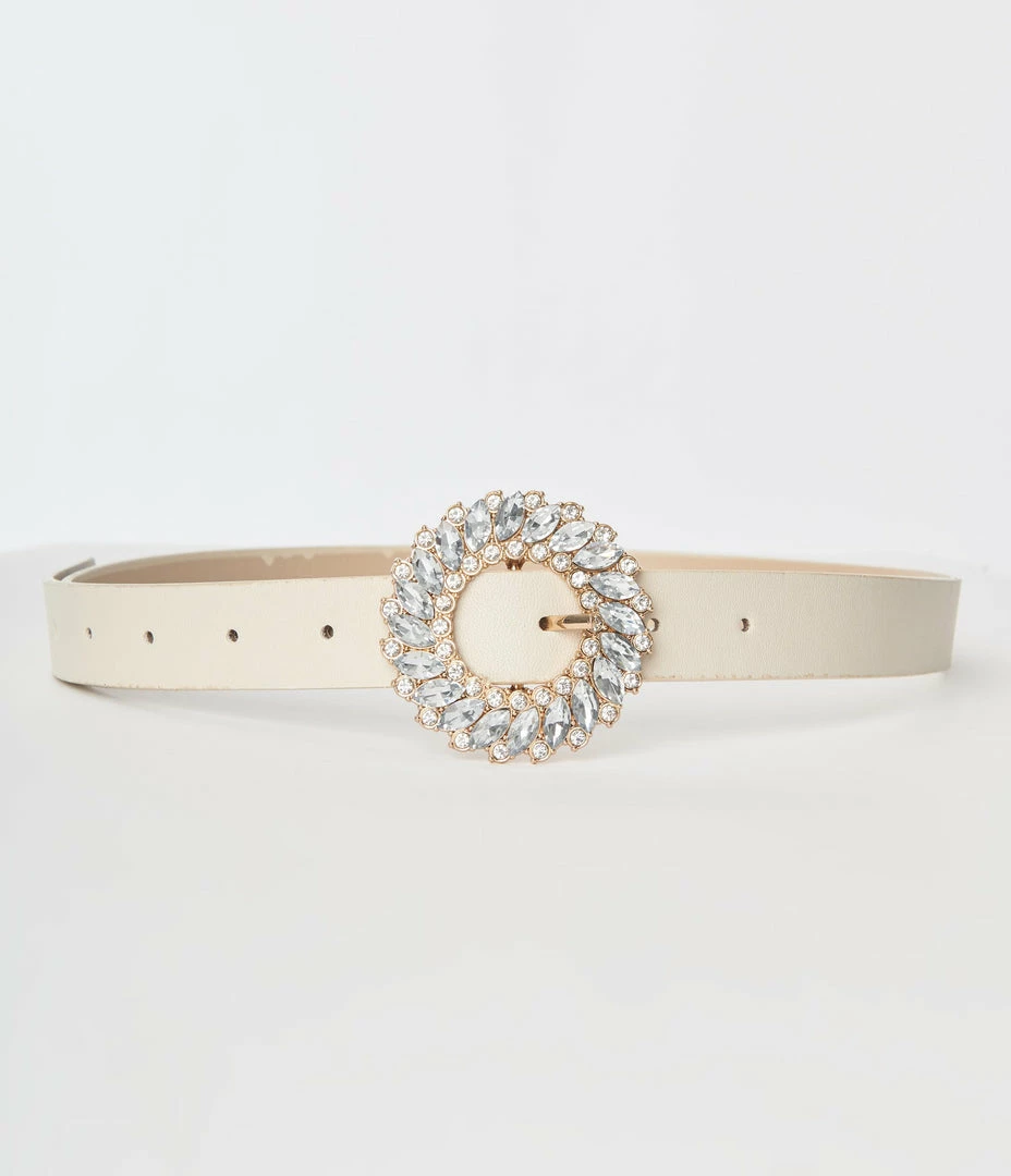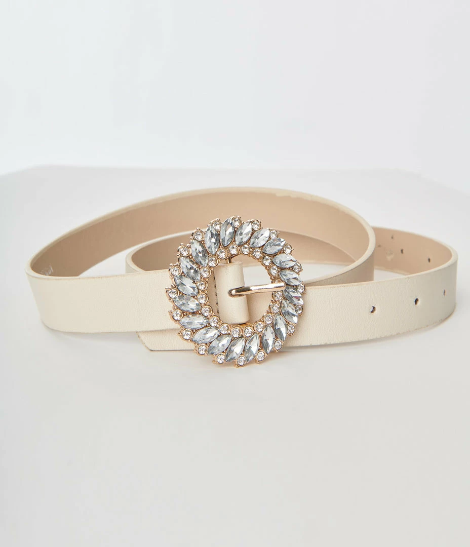 This fabulous belt is crafted in an ivory leatherette and secured with a dazzling rounded rhinestone pin belt buckle.
