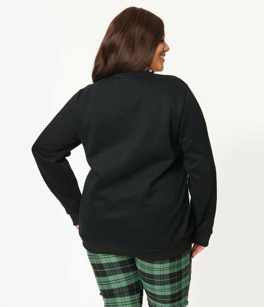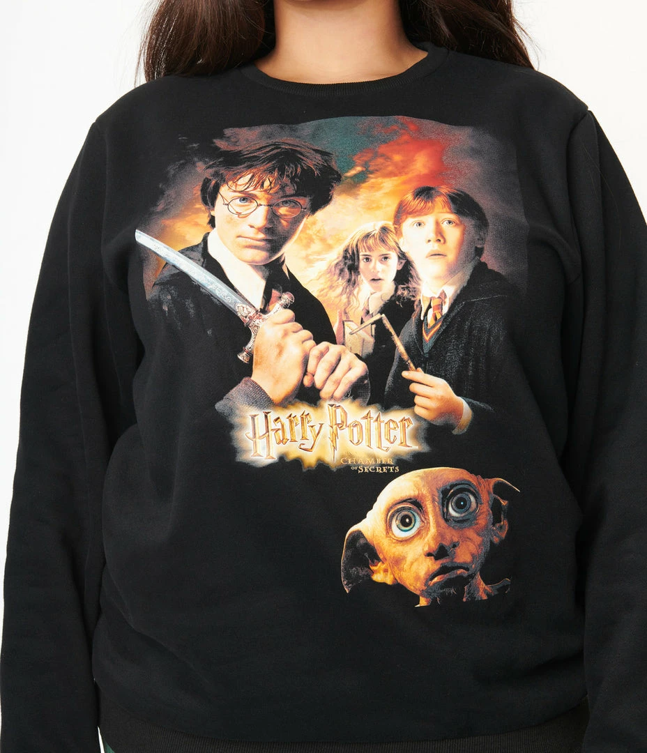 All aboard the train to Hogwarts! This Cakeworthy plus size unisex sweatshirt is crafted in a black knit blend with a fleece-like interior and boasts a screen print of Harry Potter and the Chamber of Secrets. The crew neckline and cozy long sleeves will have you ready for a trip to Hogsmeade!
