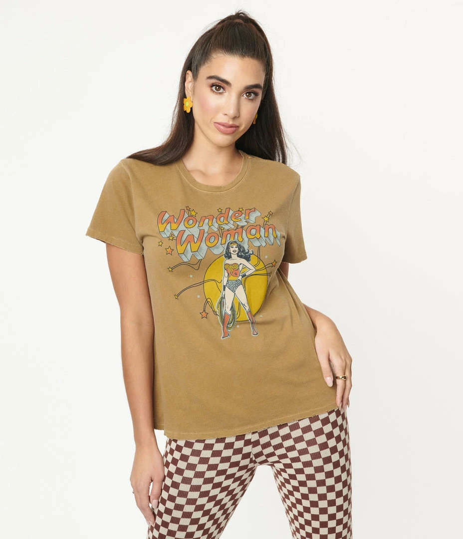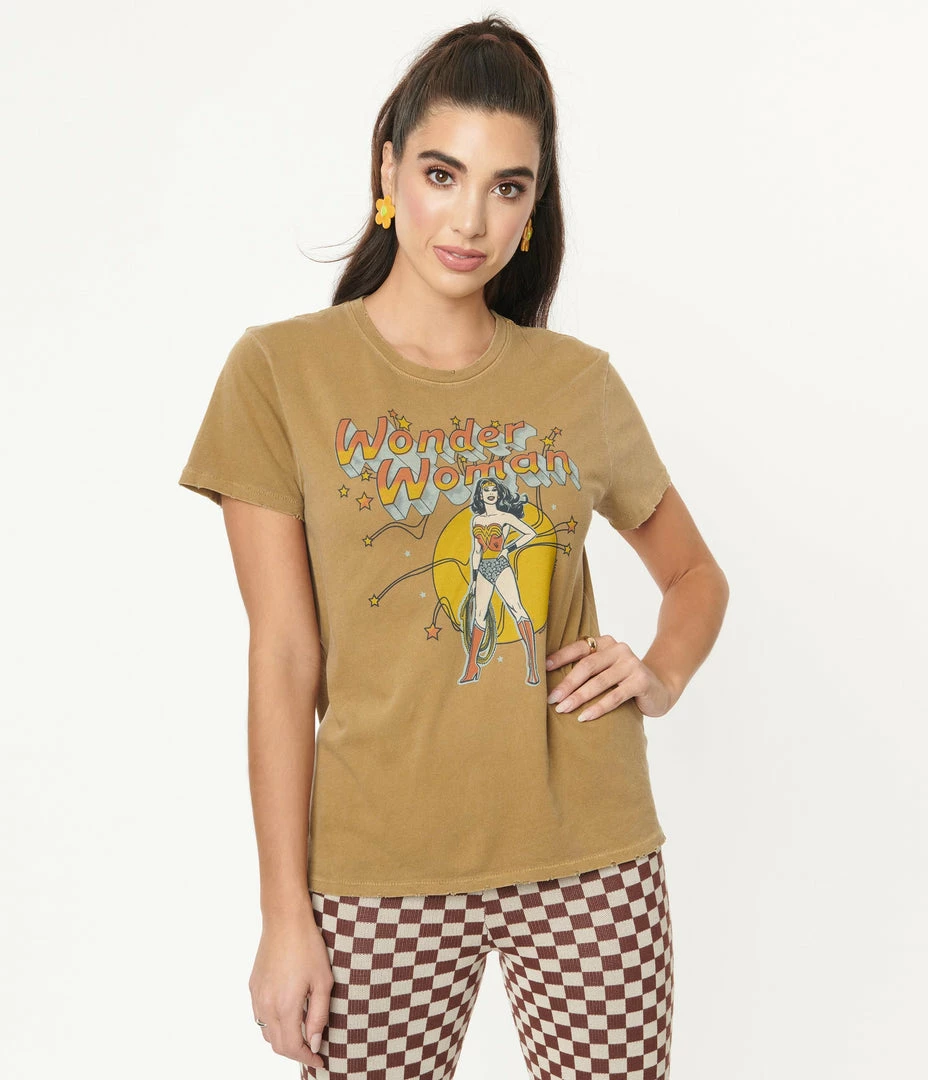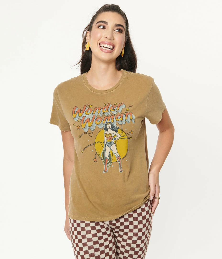 You are stronger than you believe, darling! This unisex graphic tee by Junk Food is crafted in brown cotton and boasts a screen print graphic of DC Comics Wonder Woman. Complete with a distressed style crew neckline, short sleeves, and casual oversized fit!