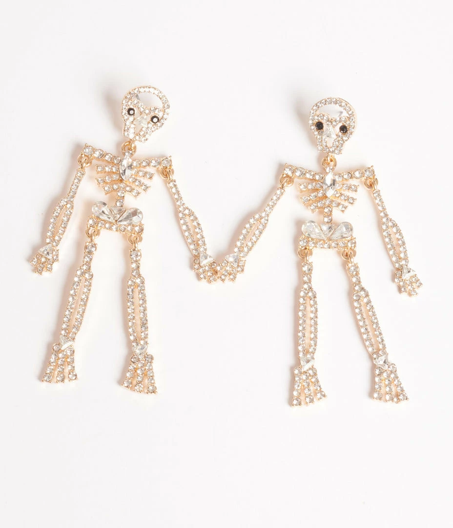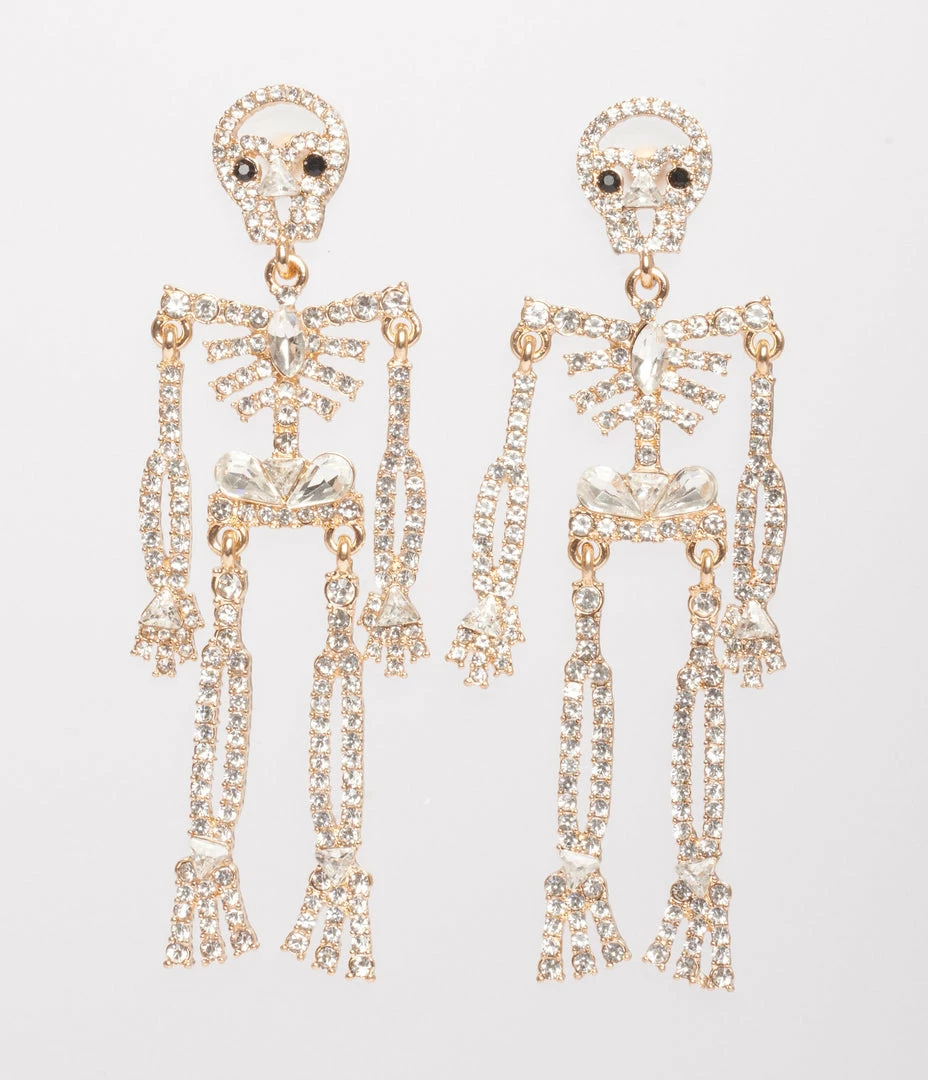 Add a dash of spooky to your style with these dazzling skeleton drop earrings, crafted in gold hardware and sparkling with rhinestones throughout. Secured with post backs!