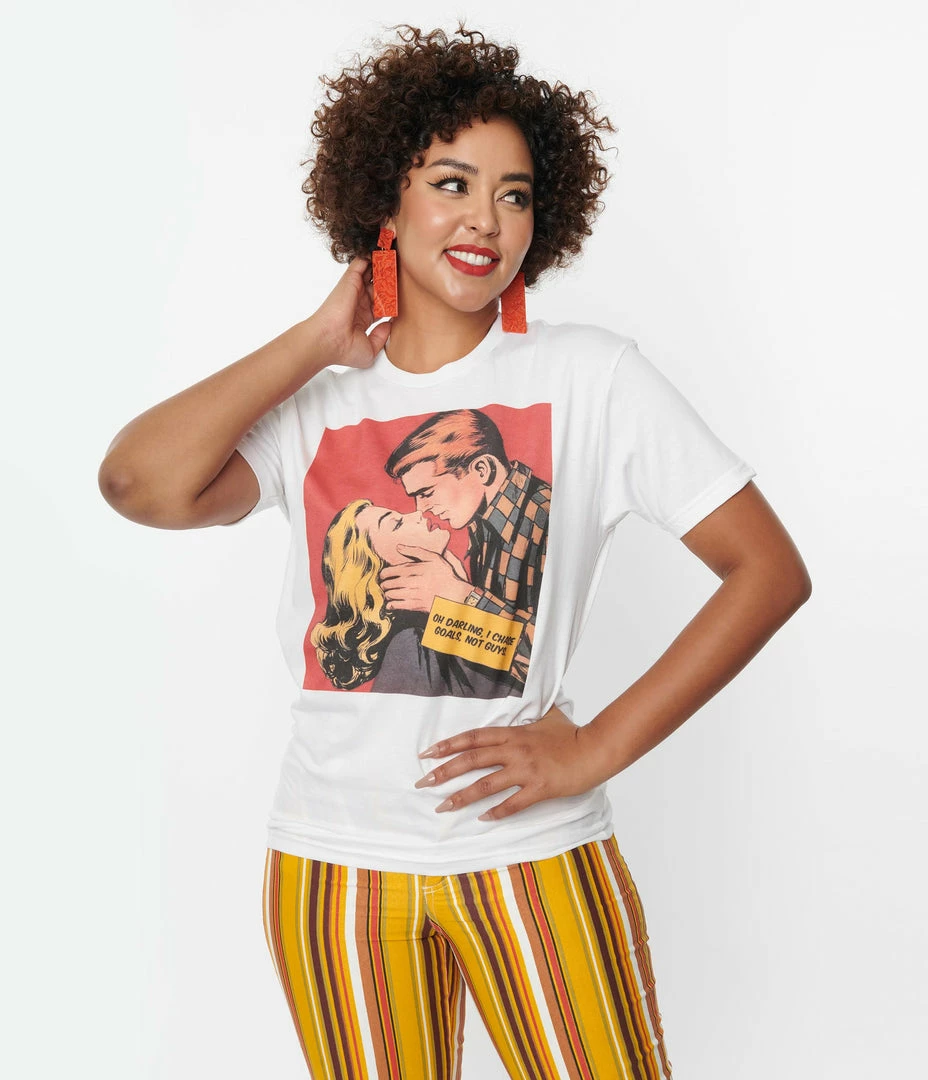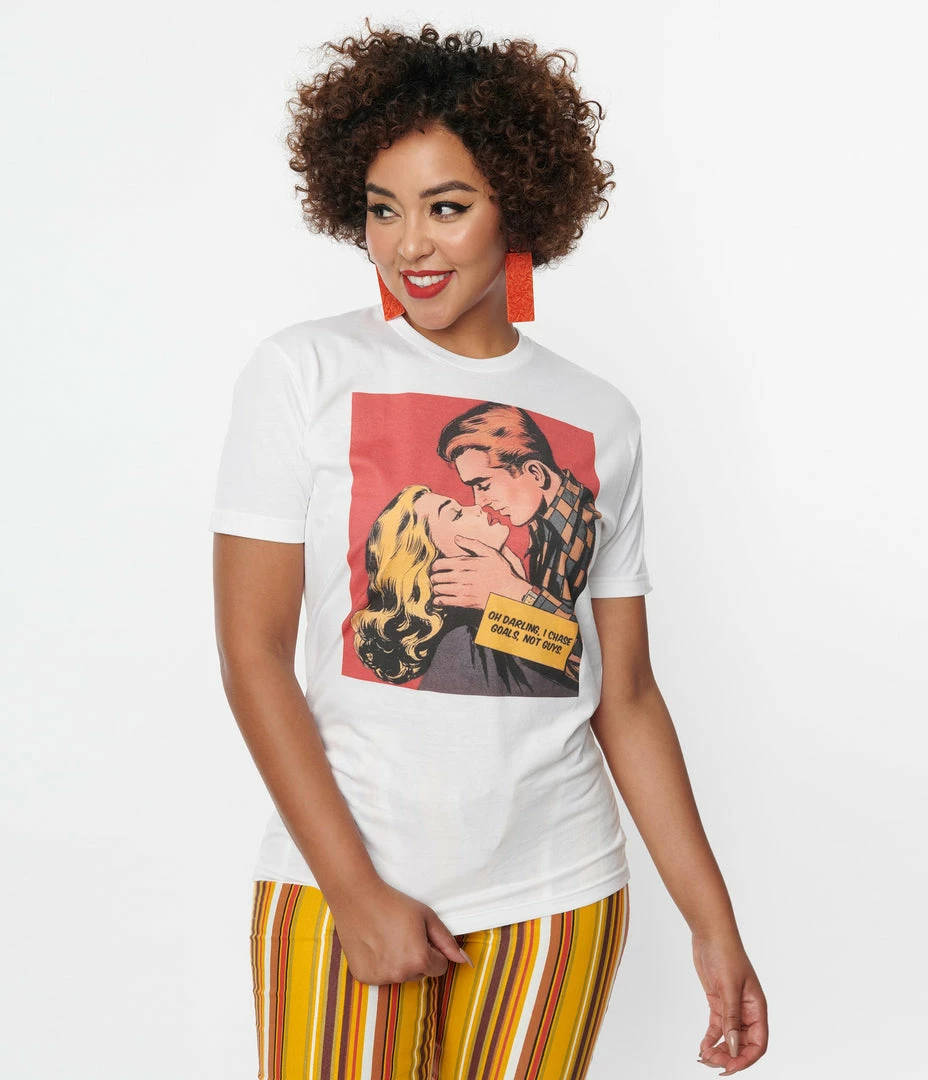 This fitted tee is crafted in white cotton and boasts a pop art style graphic print of a man and woman almost kissing and the font โOh Darling, I chase goals, not guysโ.