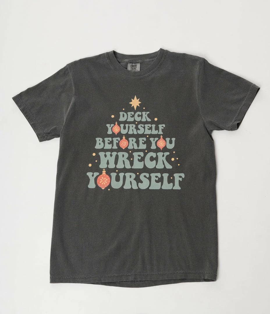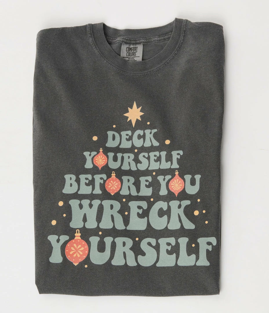This festive unisex holiday long sleeve tee is crafted in grey cotton and features a graphic print of the font “Deck Yourself Before You Wreck Yourself”.