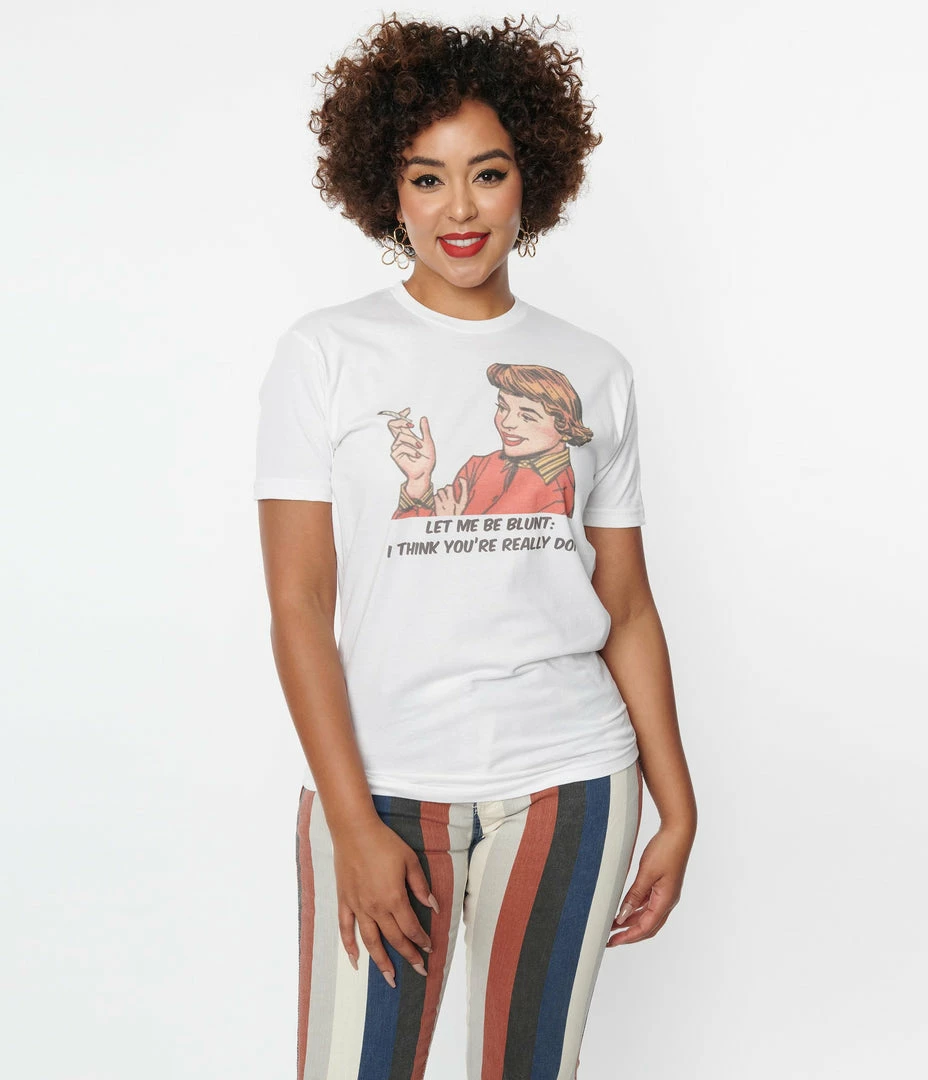 This fitted tee is crafted in white cotton and boasts a graphic print of woman smoking above the font โLet me be blunt, I think youโre really dopeโ.