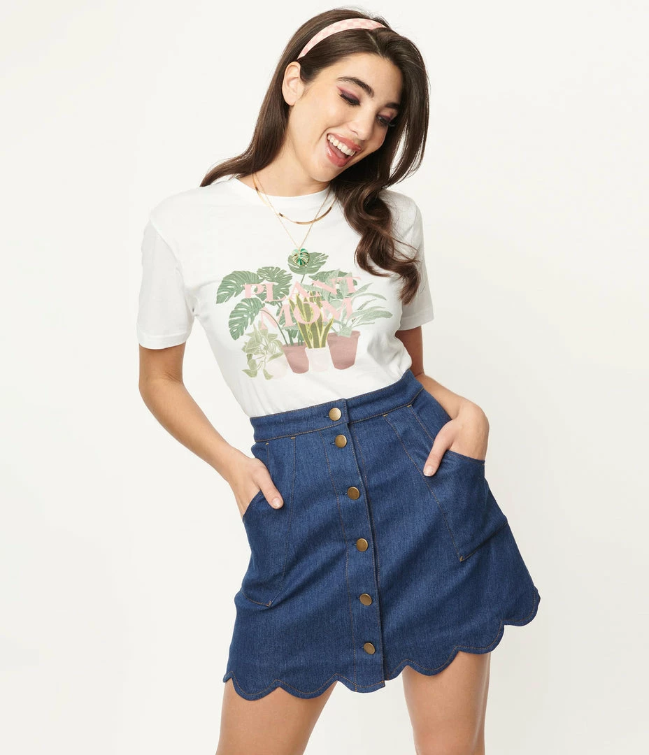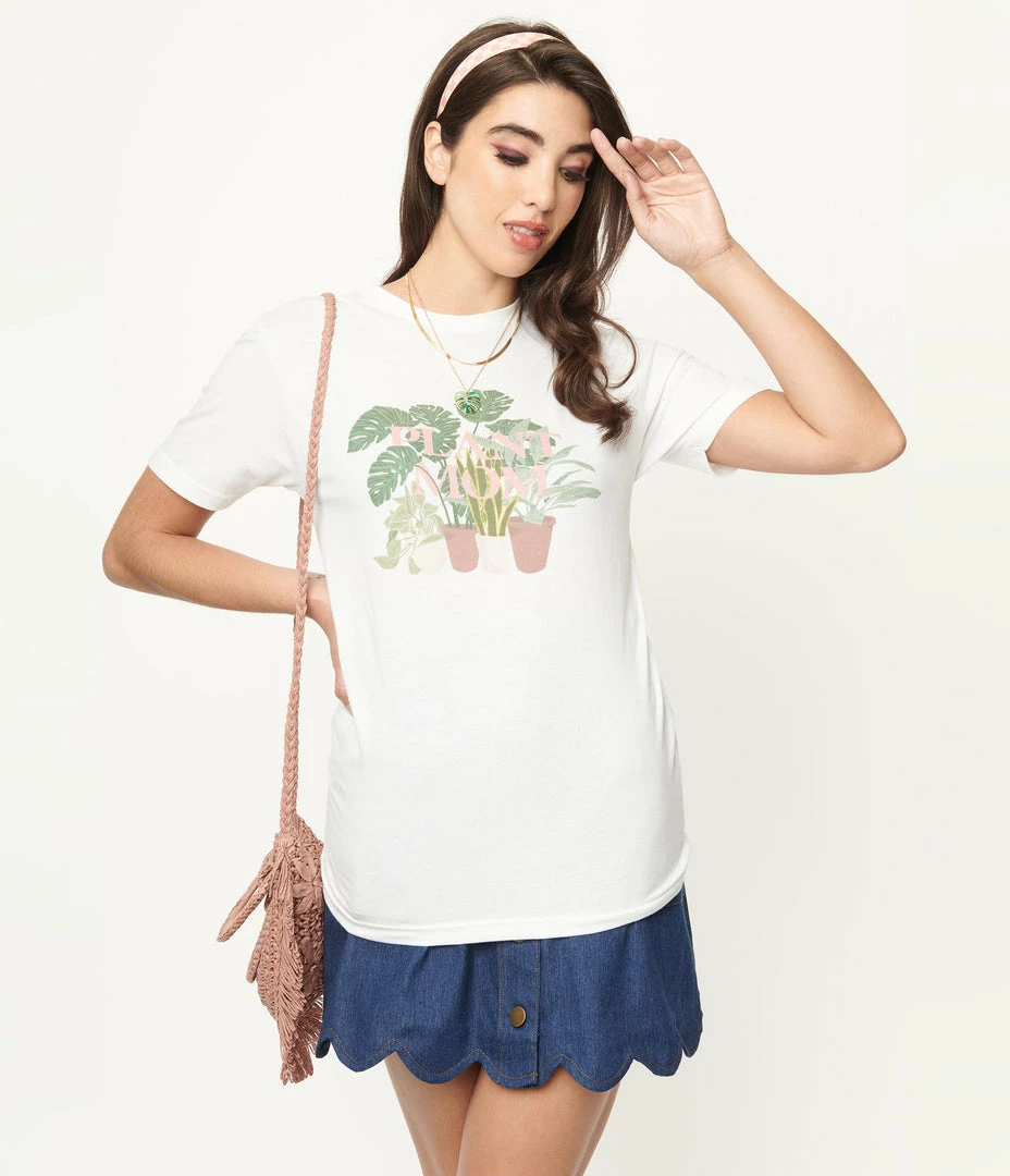 This comfortable unisex tee is crafted in a white cotton that features a screen print of a for potted plants behind the words, “Plant Mom”. Complete with a crew neckline and short sleeves.