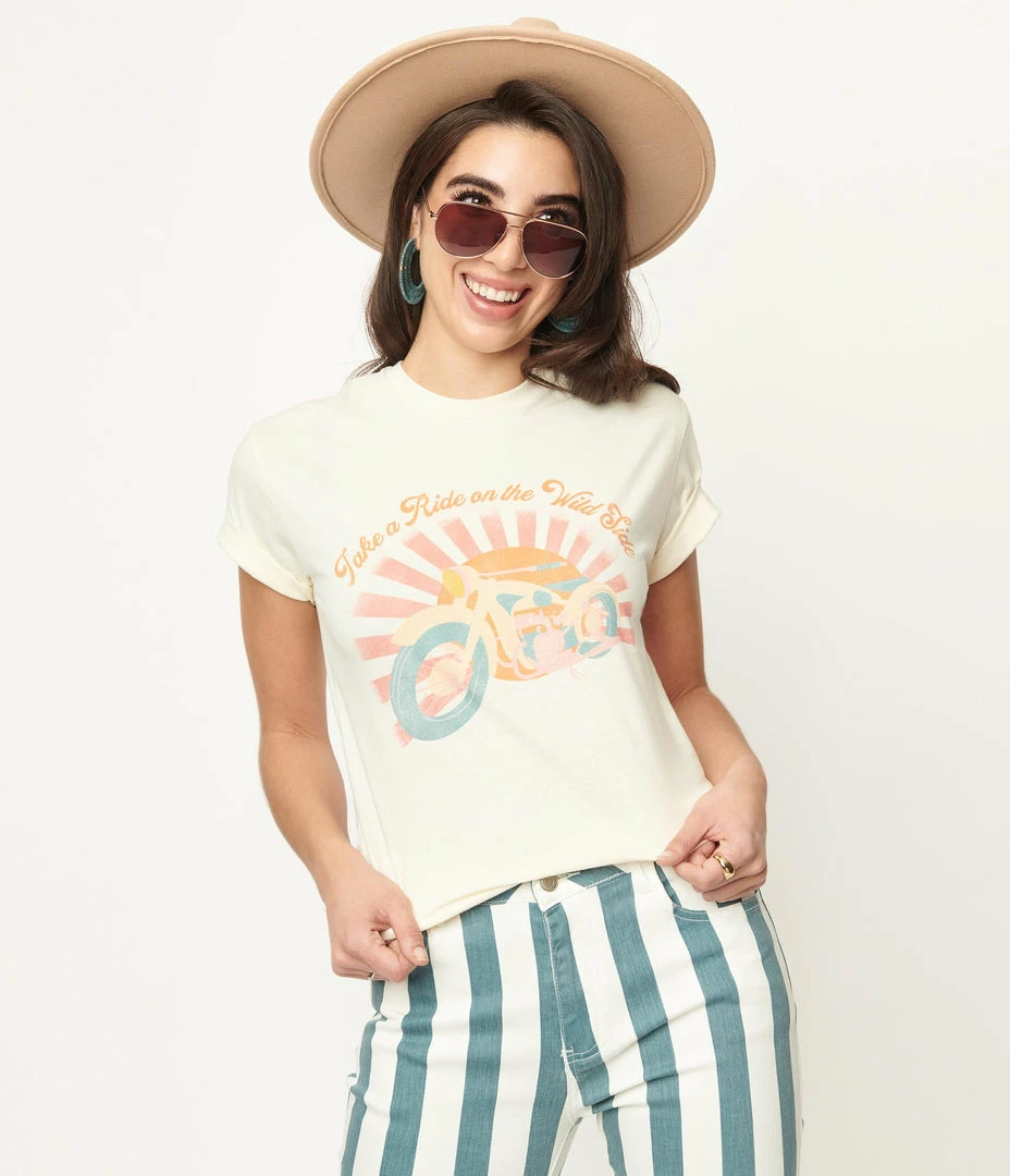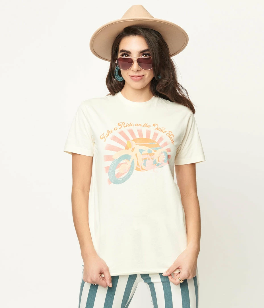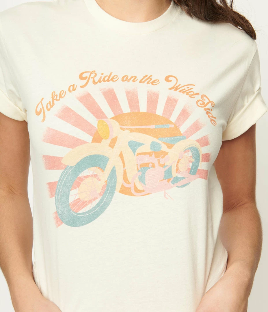 Crafted in a soft cream cotton knit boasting a graphic print of a bright orange sun and a motorcycle with the font ‘Take a ride on the wild side’. Complete with crew neck, short sleeves, and unisex fit.