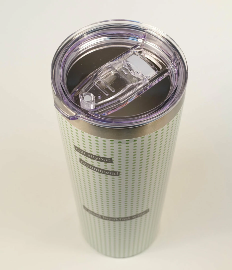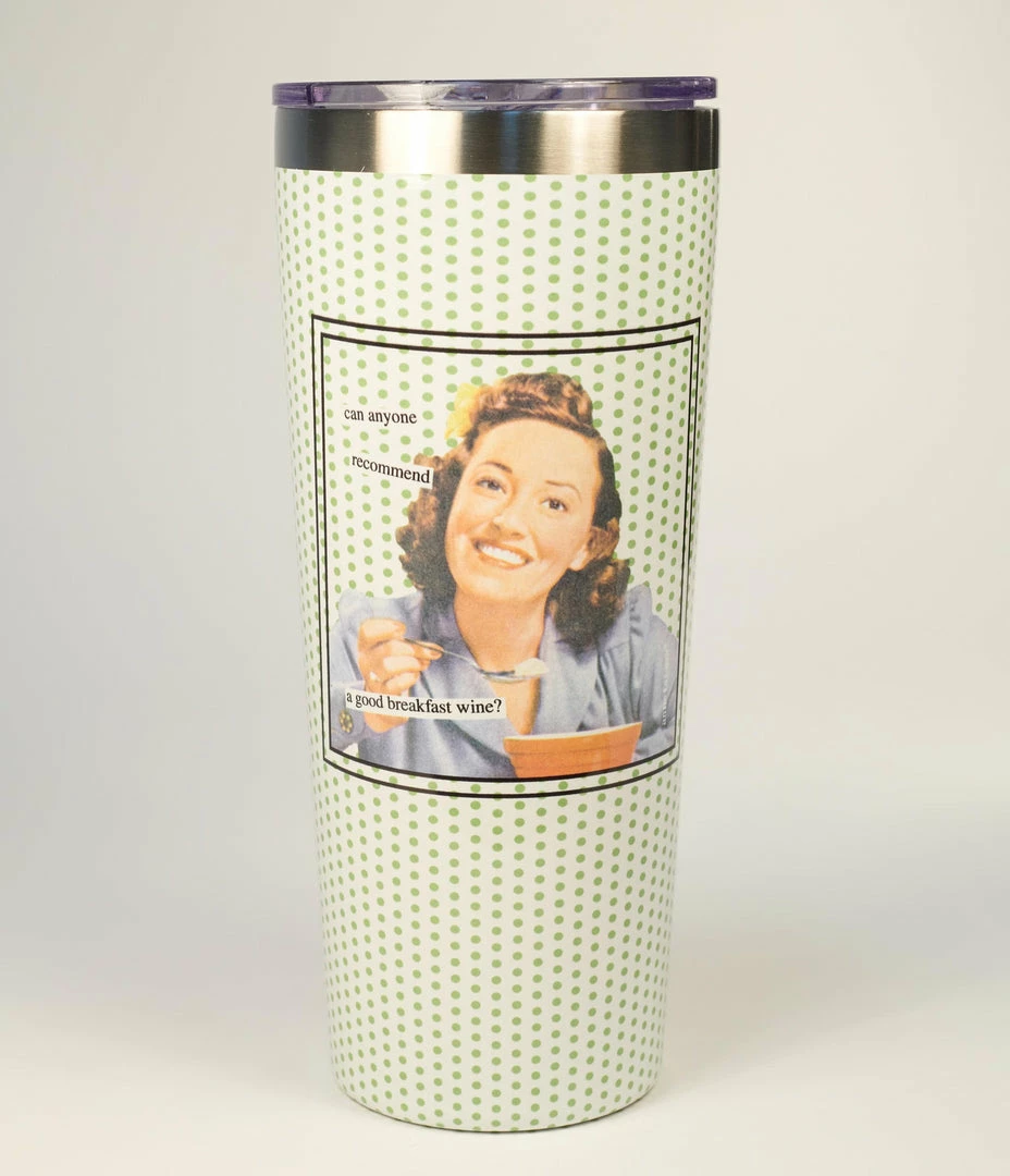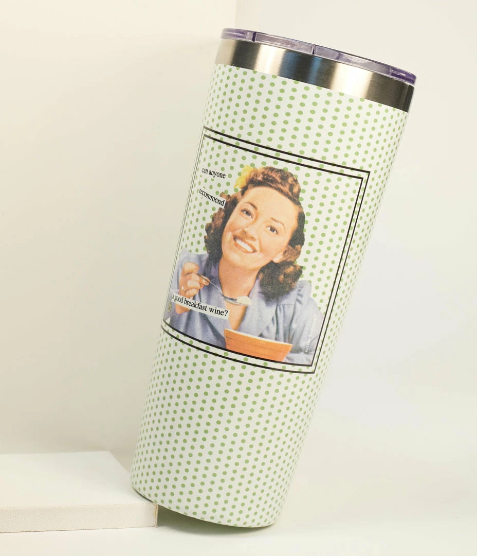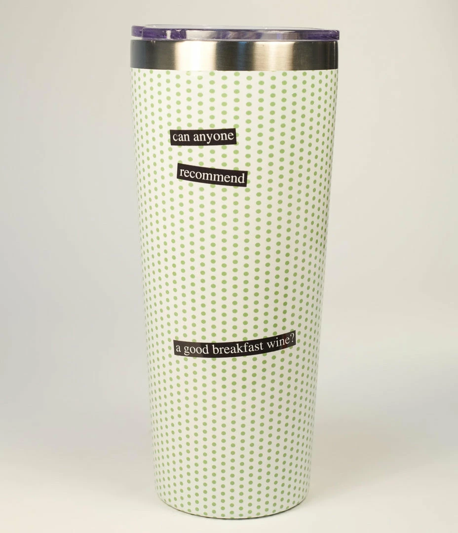 Ask lifeโs most important question, doll! This adorable tumbler is crafted in stainless steel and boasts a fun print with green polka dots dancing throughout the white background and a vintage style photo of a woman eating yogurt with the font โCan anyone recommend a good breakfast wine?โ. Complete with a slide close lid!