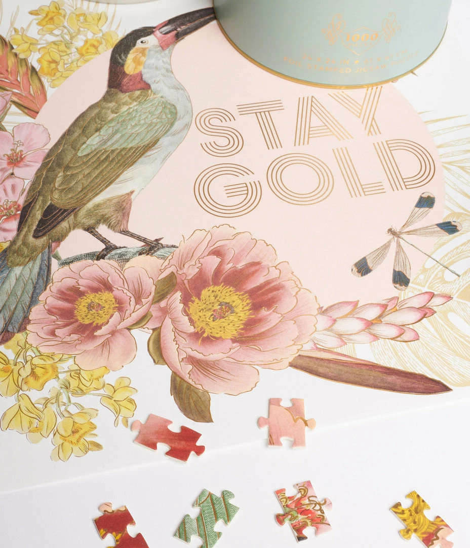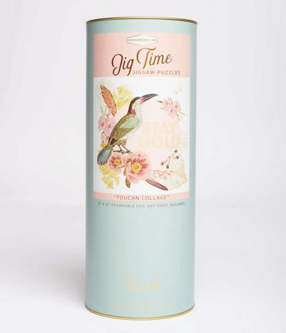 This adorable puzzle boasts a sweet collage print with pink florals, a toucan, and the foil stamped font ‘Stay Gold’. The 1000 piece puzzle comes with a 12” by 12” frameable art print!