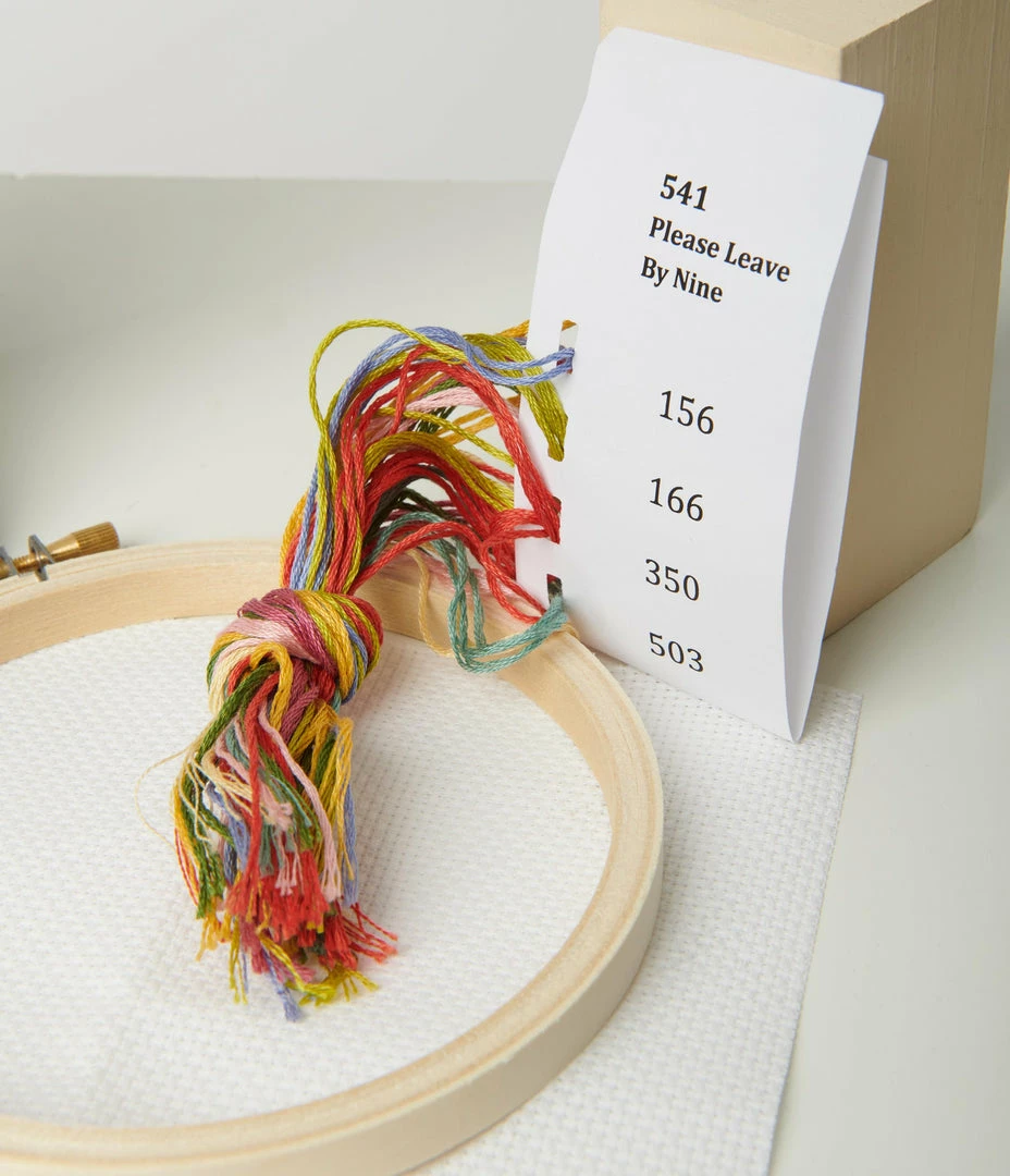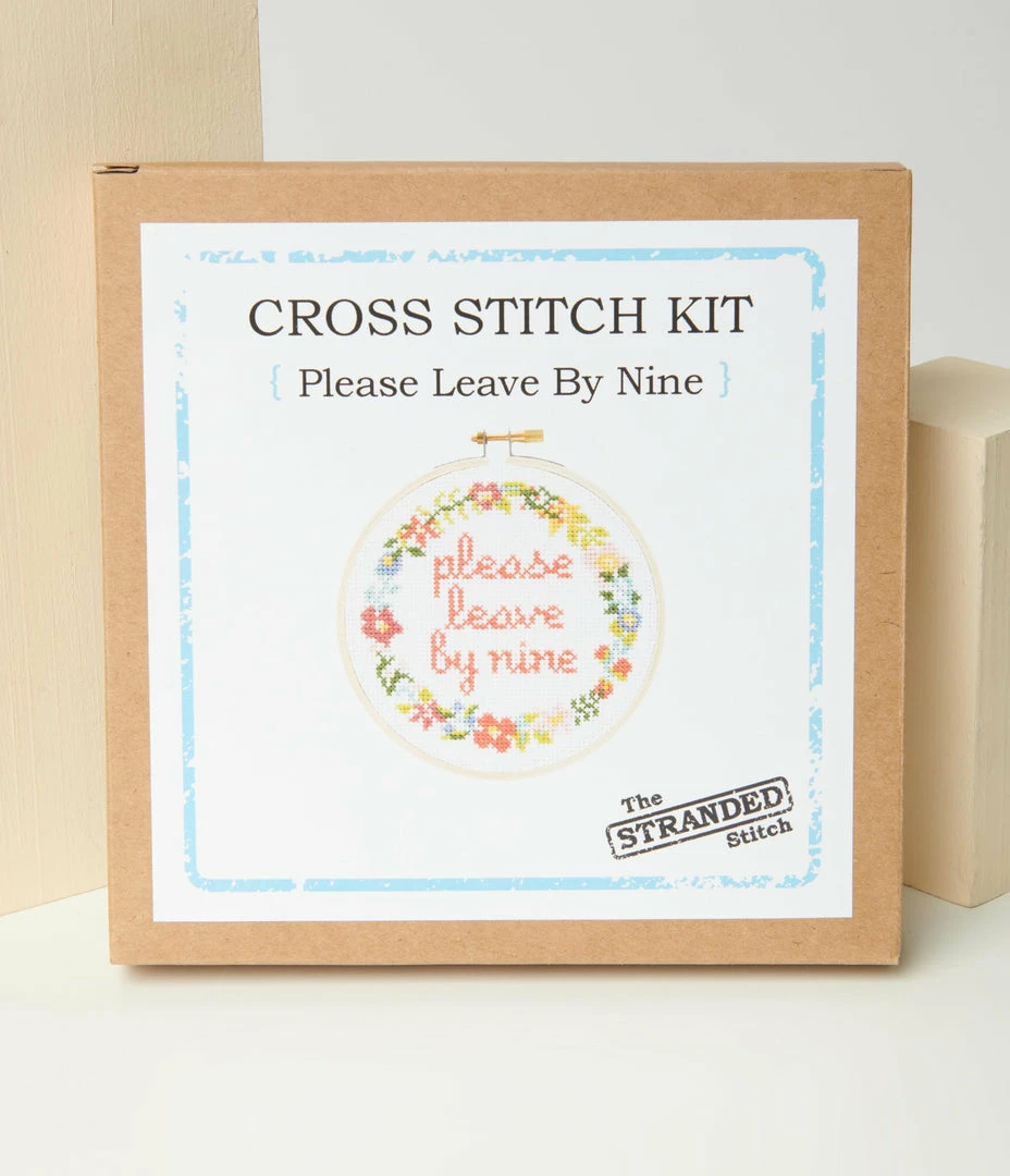 Your saucy introduction to cross stitch! Just count your stitches as you follow along the pattern of this notice to โPlease Leave By Nineโ. All you need is a pair of scissors and the rest is in the box!
