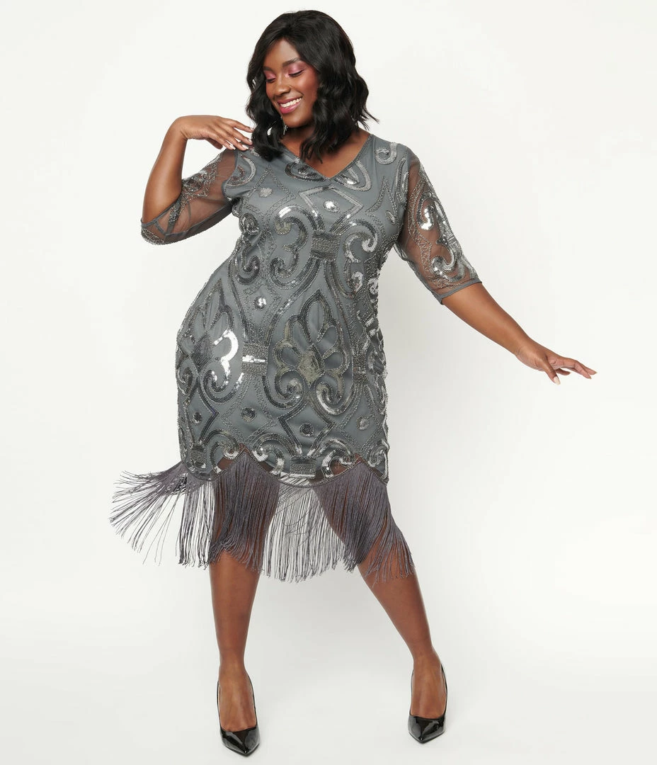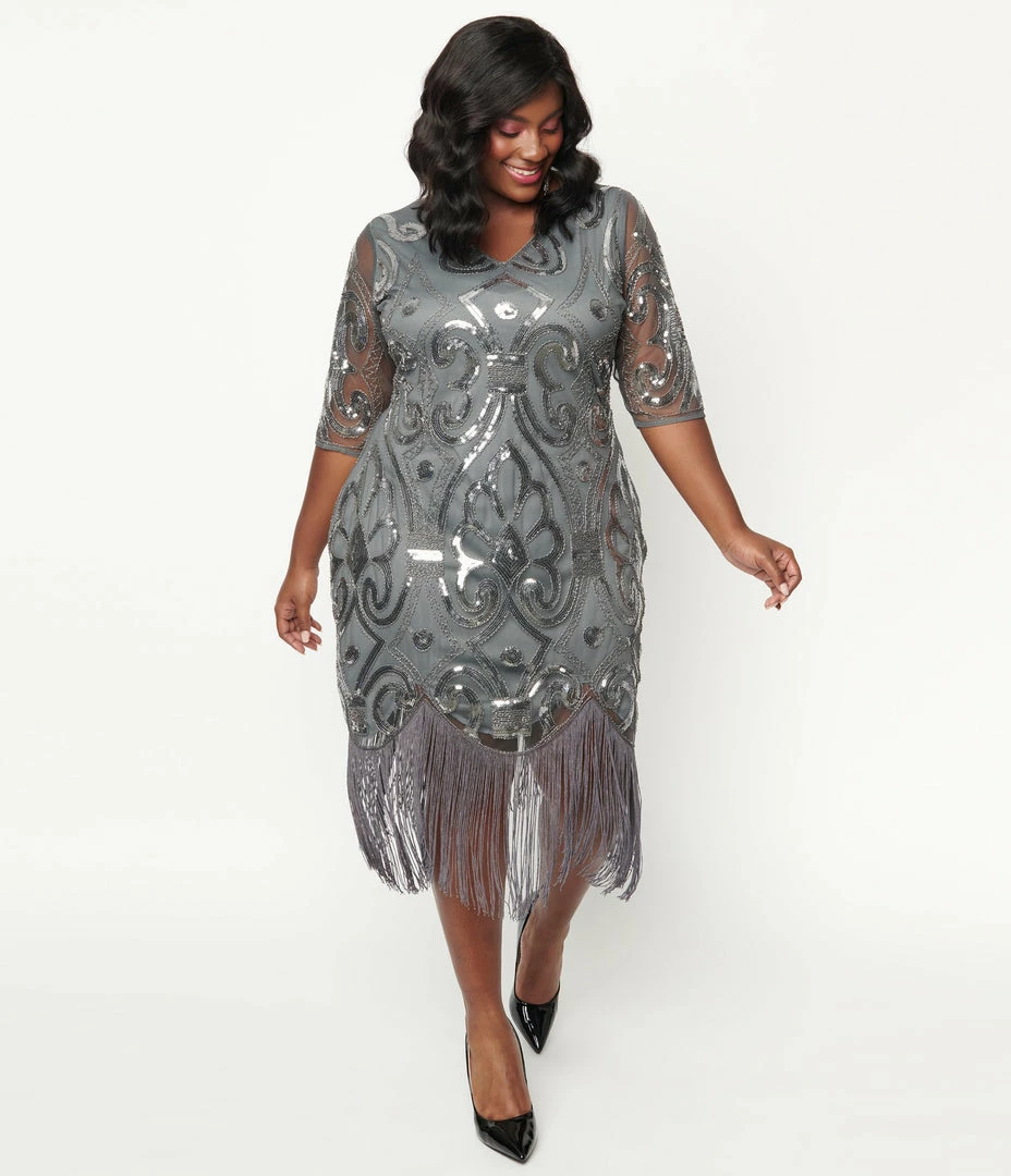 Give them a little swagger, dames! The 1920s are roaring back in this stunning gown from Unique Vintage, boasting flapper sensibilities with modern fabulousness. The plus size Lynette Flapper Dress boasts beautiful grey mesh over dark grey knit lining for a sultry silhouette that dazzles with beading and silver sequins. The elegant V-neckline is framed by sheer half sleeves while the tapered waist flatters your hourglass and drops into a fabulous fitted skirt that dances with a scalloped hem and long dark grey fringe. Outfitted with a side zipper, itโs a Gatsby sashay!