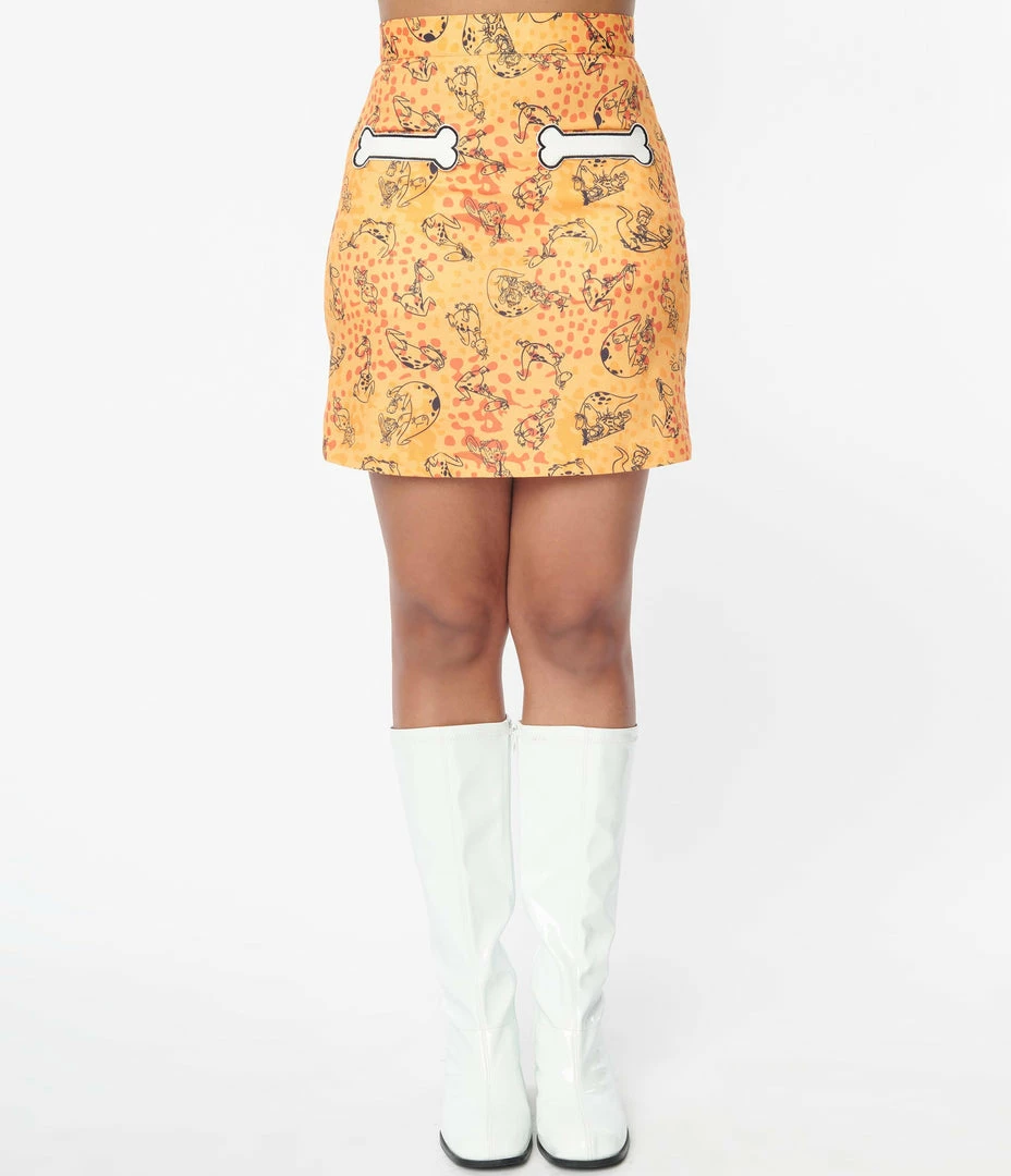 This prehistoric mini skirt is crafted in a sturdy woven fabric that dances with a print of Bam Bam, Bubbles, Fred, and Dino from The Flintstones, throughout the mustard yellow and orange backdrop. The banded waist is cinched with a back zipper and complete with pockets embellished with bones.