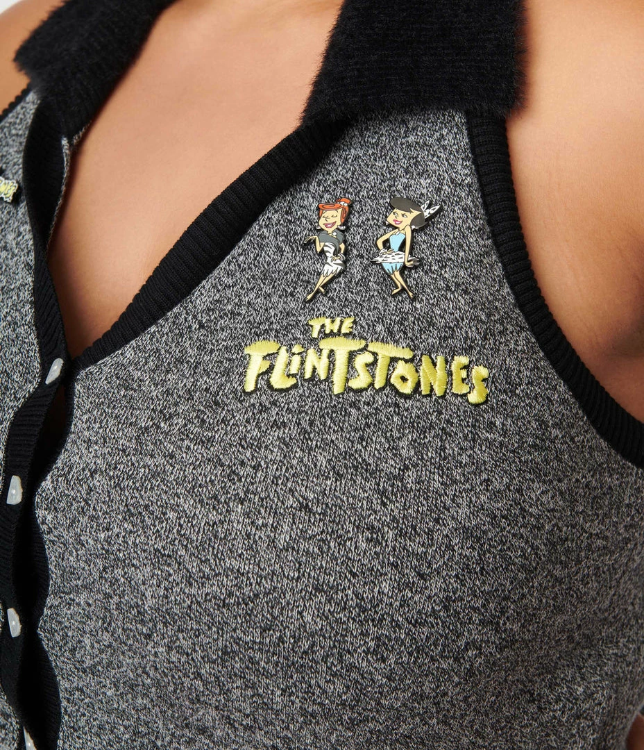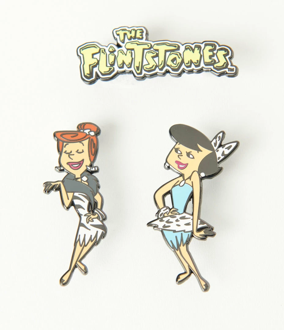 An adorable pin set in a collaboration with The Flintstones, this set of three sweet enamel pins feature Wilma, Betty, and the Flintstones logo.. Secured with butterfly clutch backs.
