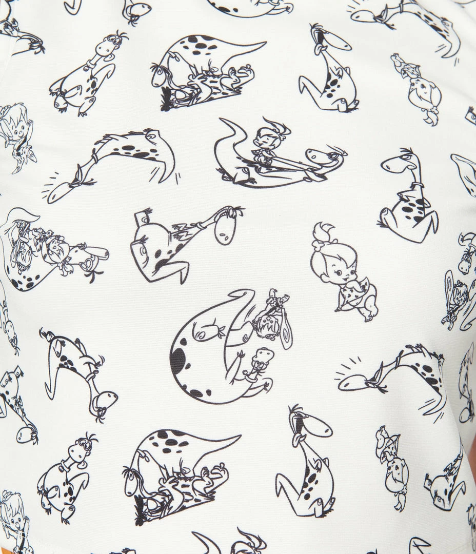 This sleeveless stretch knit top dances with a print of Bam Bam, Bubbles, Fred, and Dino from The Flintstones, throughout the white backdrop. Boasting a sweet scalloped neck detail, this adorable crop is full of prehistoric flare.