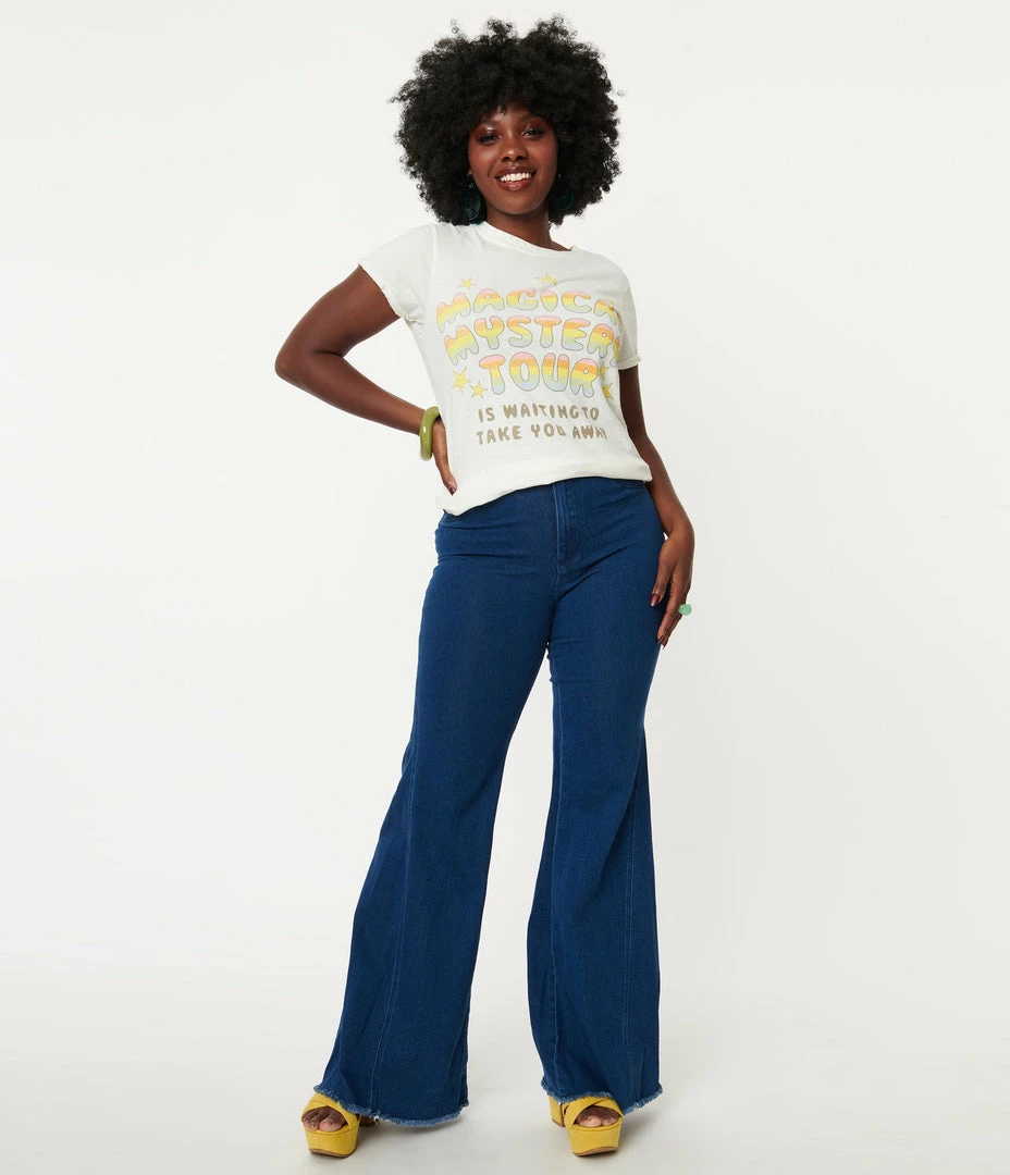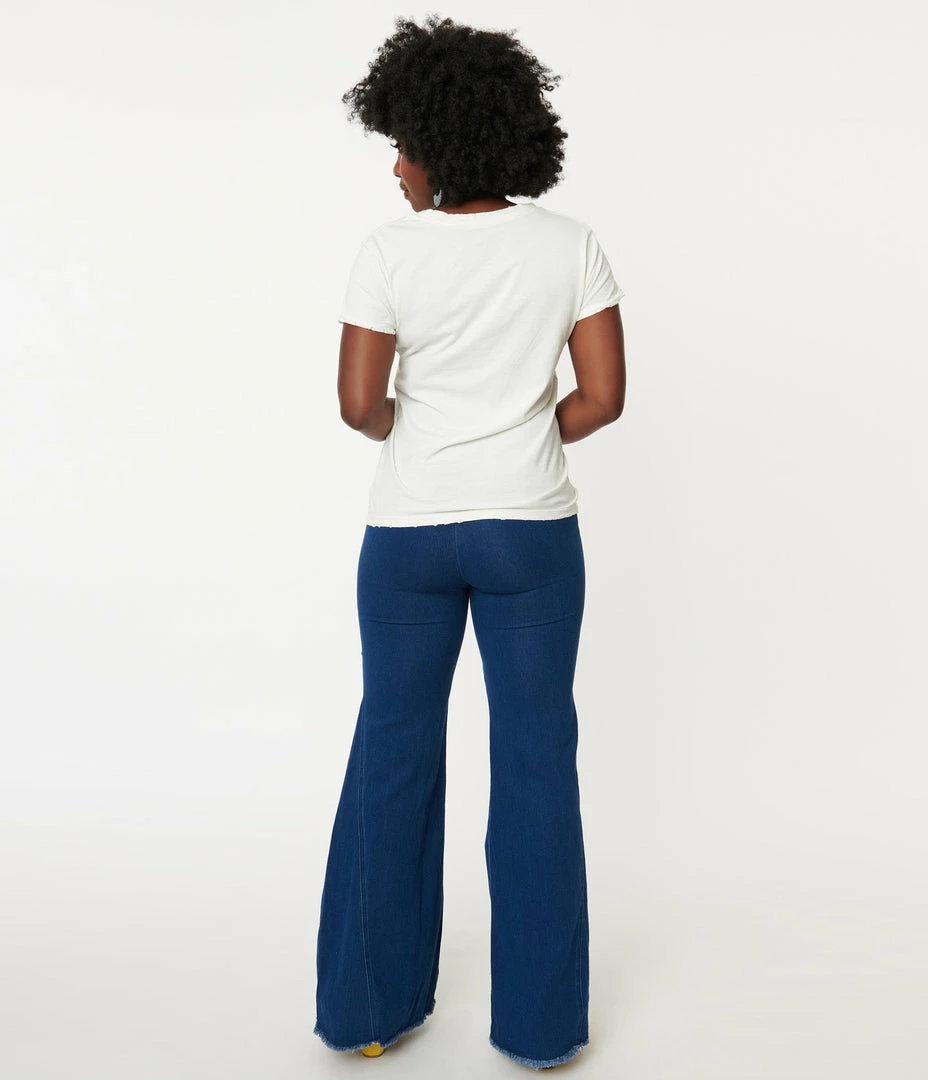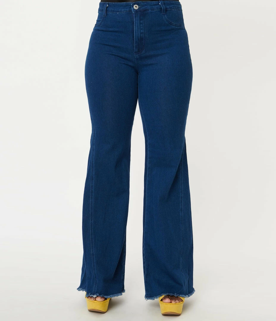 It’s haute on the horizon, dolls! A heart-stopping pair of jeans for a vintage vixen, these medium indigo blue separates are crafted in a marvelous cotton stretch to flatter your feminine assets. The high waist is cinched with a front zipper while faux side and back pockets provide retro accent. Complete with a flared pant leg and distressed hem!