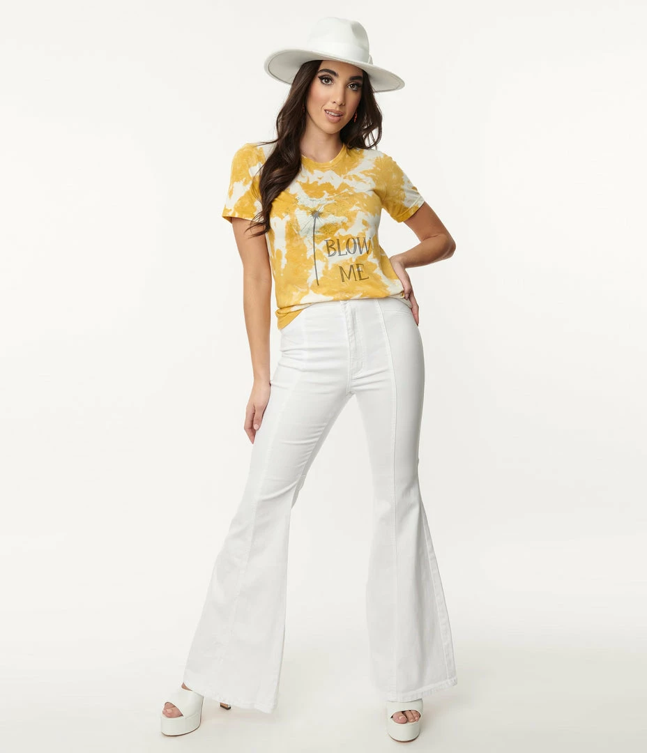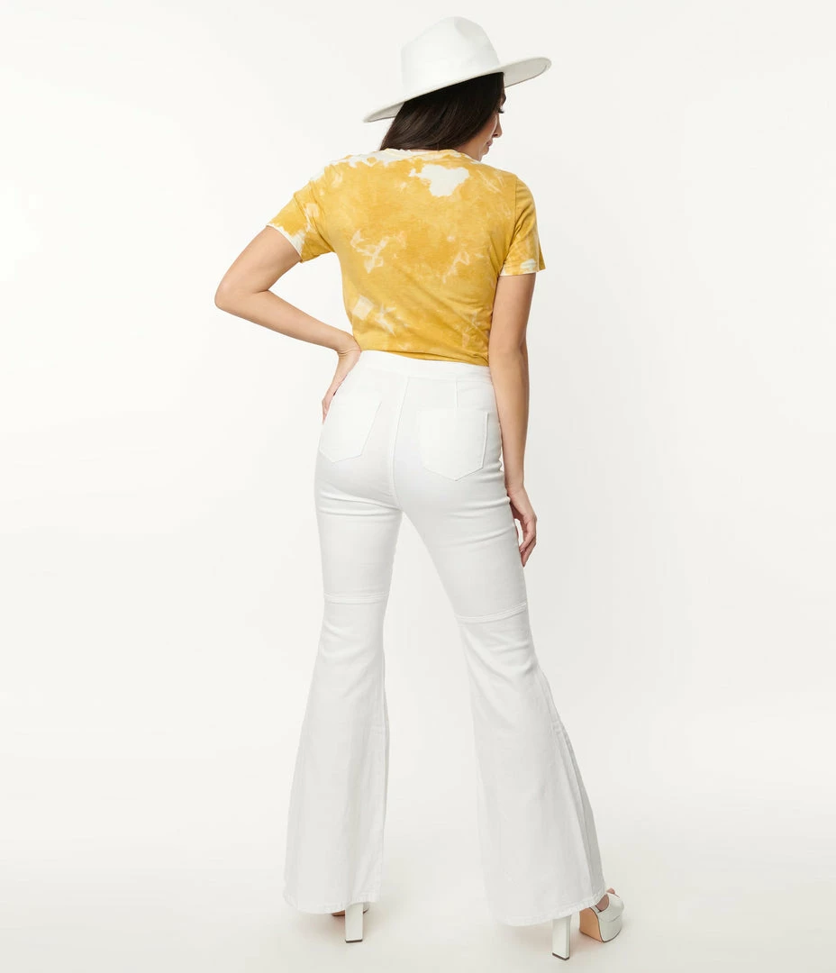 Bring in that retro flare, dolls! These striking jeans are crafted in a striking white stretch cotton and boast a fabulous high waist silhouette. The dramatic flare legs are accented with front pleated seam detailing that elongates your legs, while the waist is cinched with a classic front zipper and button. Complete with back pockets!