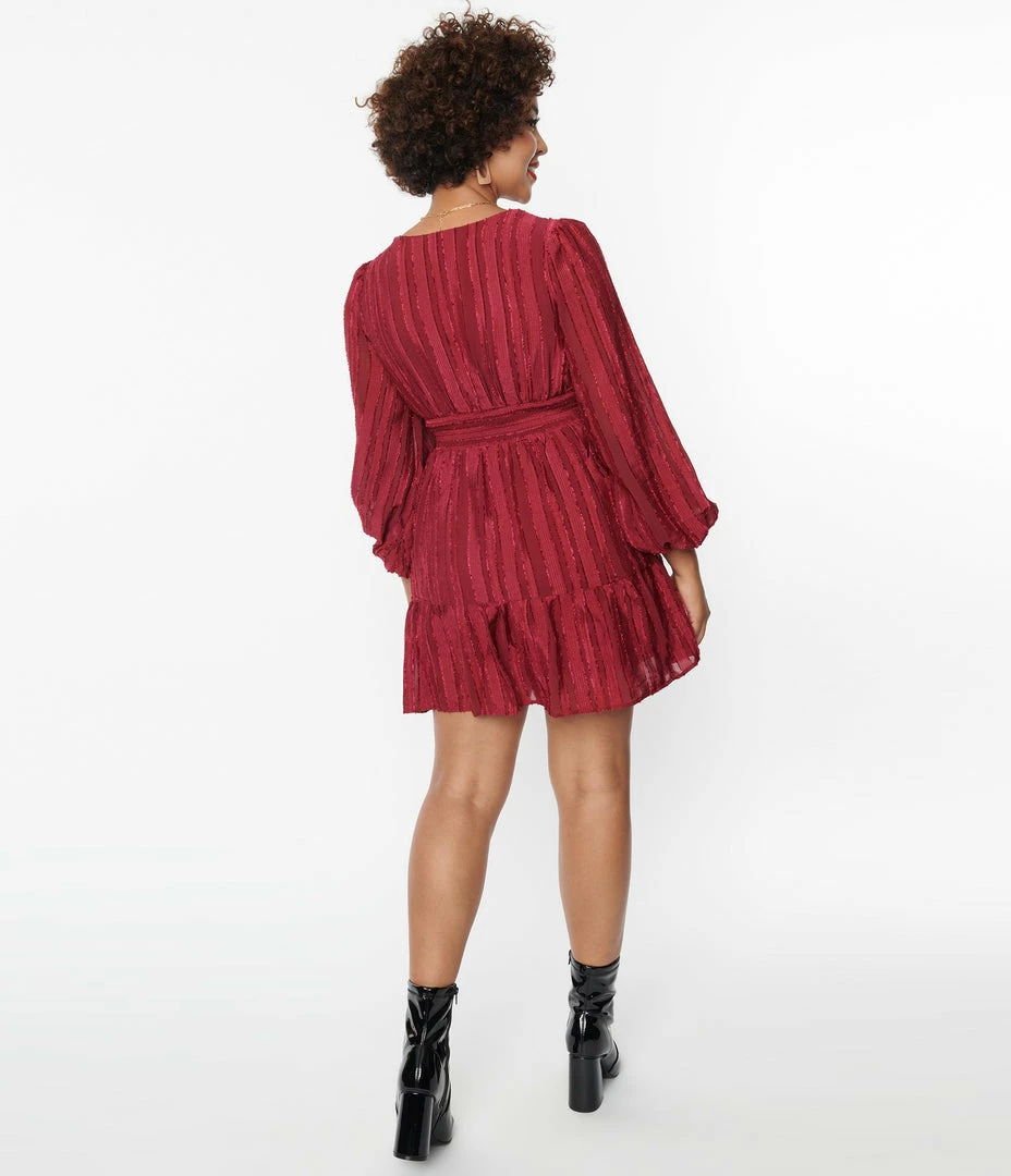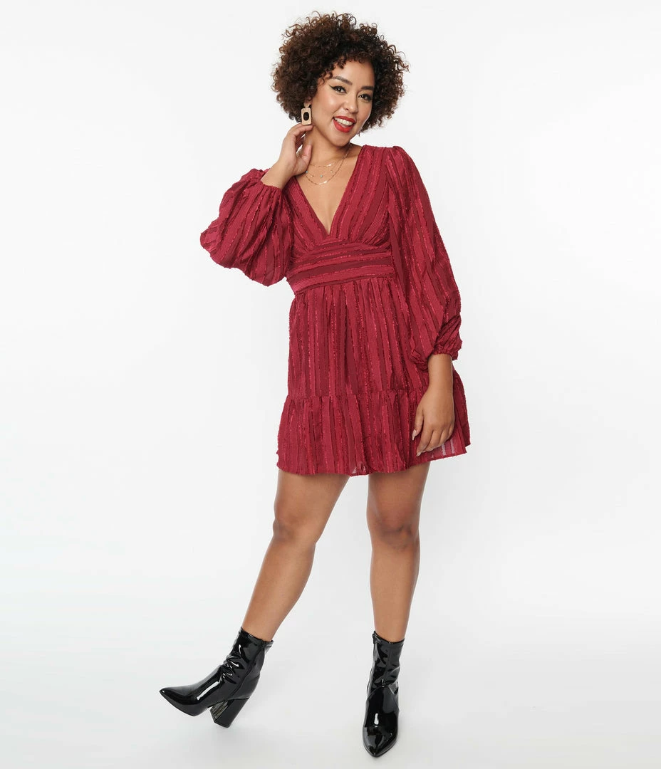 This sweet mini dress is crafted in a gorgeous wine chiffon accented with textured stripes throughout. The V-neckline is framed by long sleeves, while the flare skirt dances above your knees!