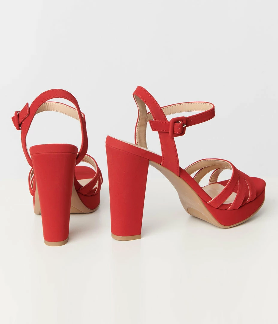 Coming in blazing hot with these stunning pair of platforms crafted in a bright red leatherette. Boasting a 1 inch platform and 4.5 inch lift, the open toe sandal design is secured with a gored and adjustable square buckle ankle strap.