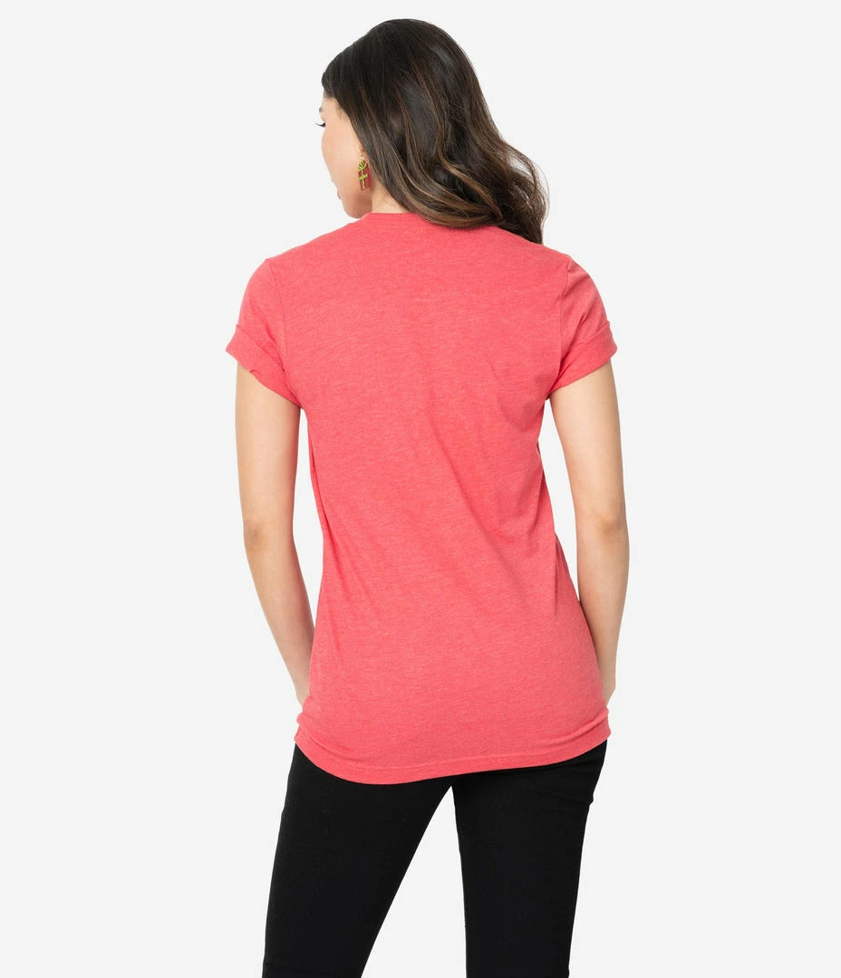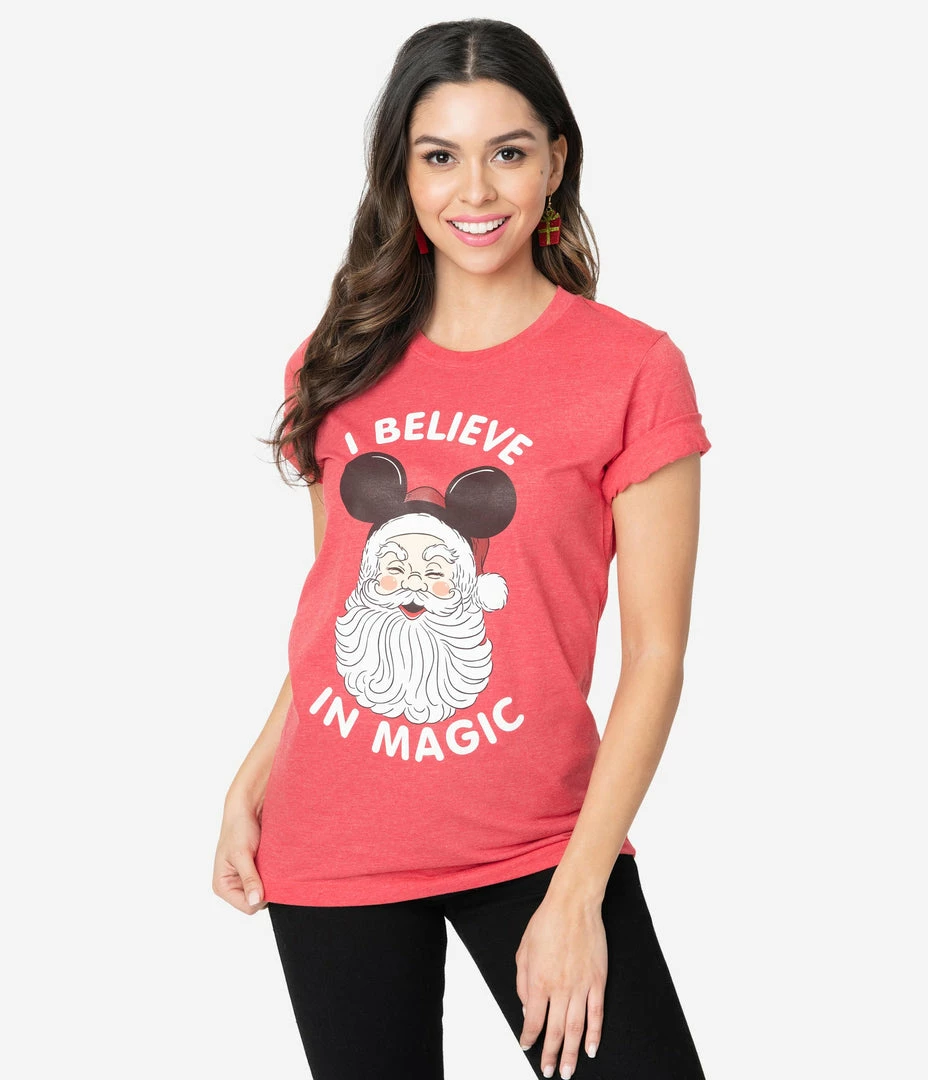 Feel the tingle in your toes, gals! This jolly red unisex tee is crafted in a delicious cotton blend and features a screen print of Olโ Saint Nick on the front, wearing mouse ears while bold font reads, โI Believe In Magicโ. Complete with a crew neckline and sweet short sleeves, sprinkle a little joy on the world!