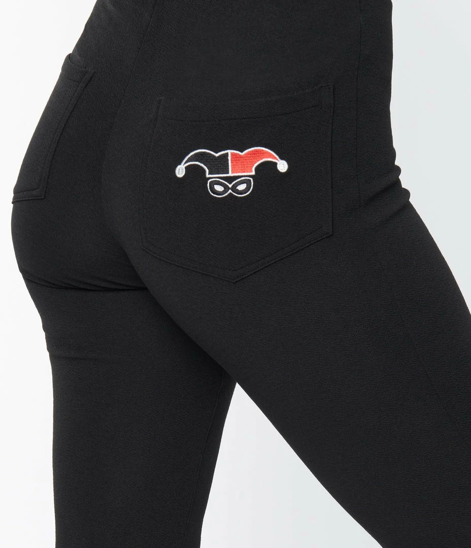 A striking set of separates in collaboration with DC Comic’s Harley Quinn. These fabulous pants are crafted in a black knit stretch and boast a Harley embroidered on the back pocket, while the dramatic flared legs feature a red and white argyle pattern from your calves to your feet!