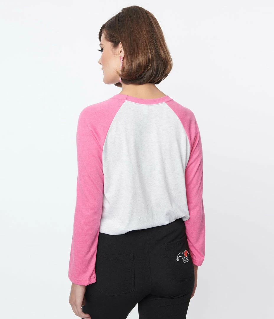 This sweet baseball tee in collaboration with DC Comicโs Harley Quinn is crafted in a soft grey knit fabric and boasts a print of Harley Quinn blowing a bubble under the font โMad Loveโ. Complete with contrasting pink three quarter length sleeves, oversize fit, and crew neck!