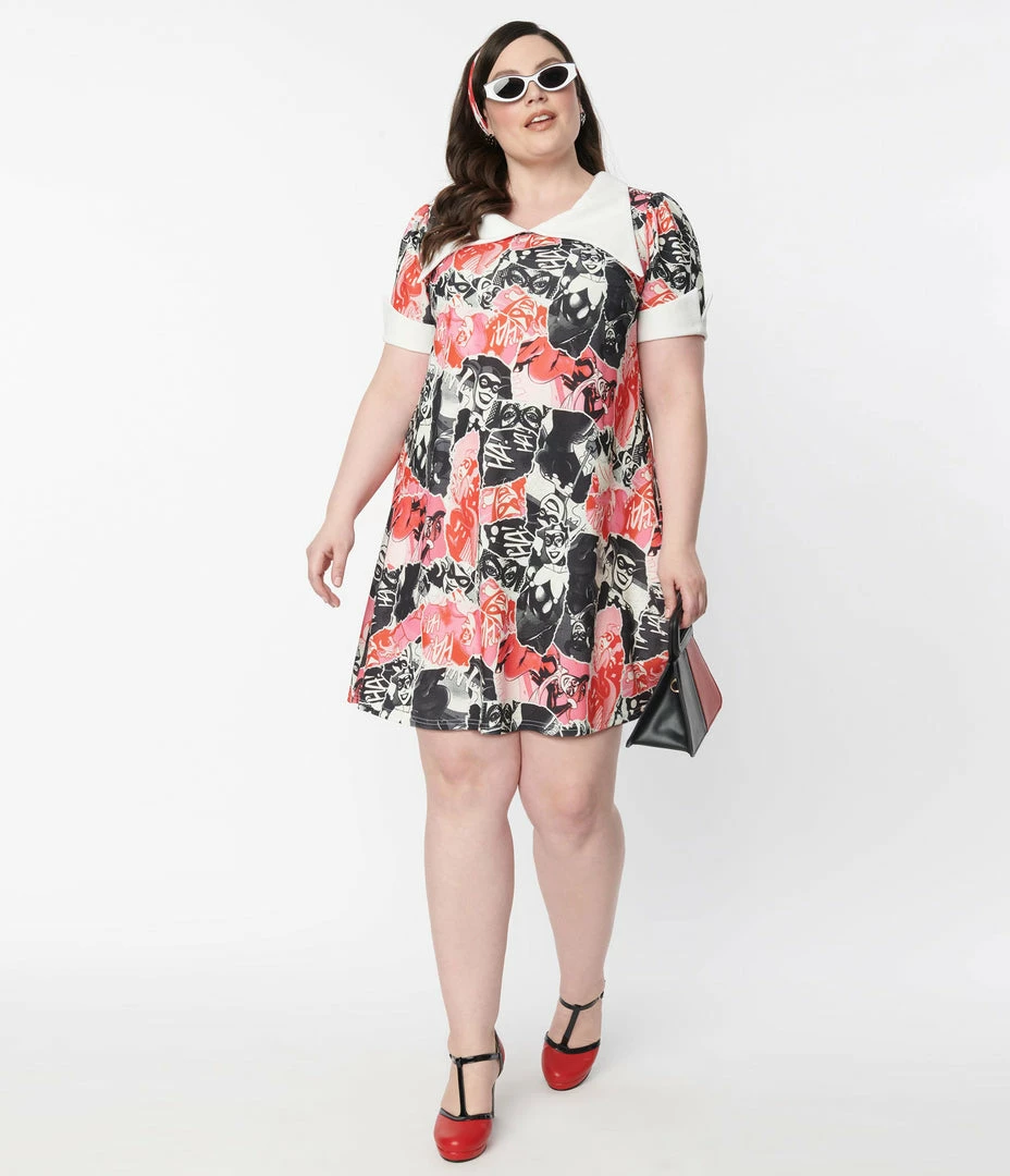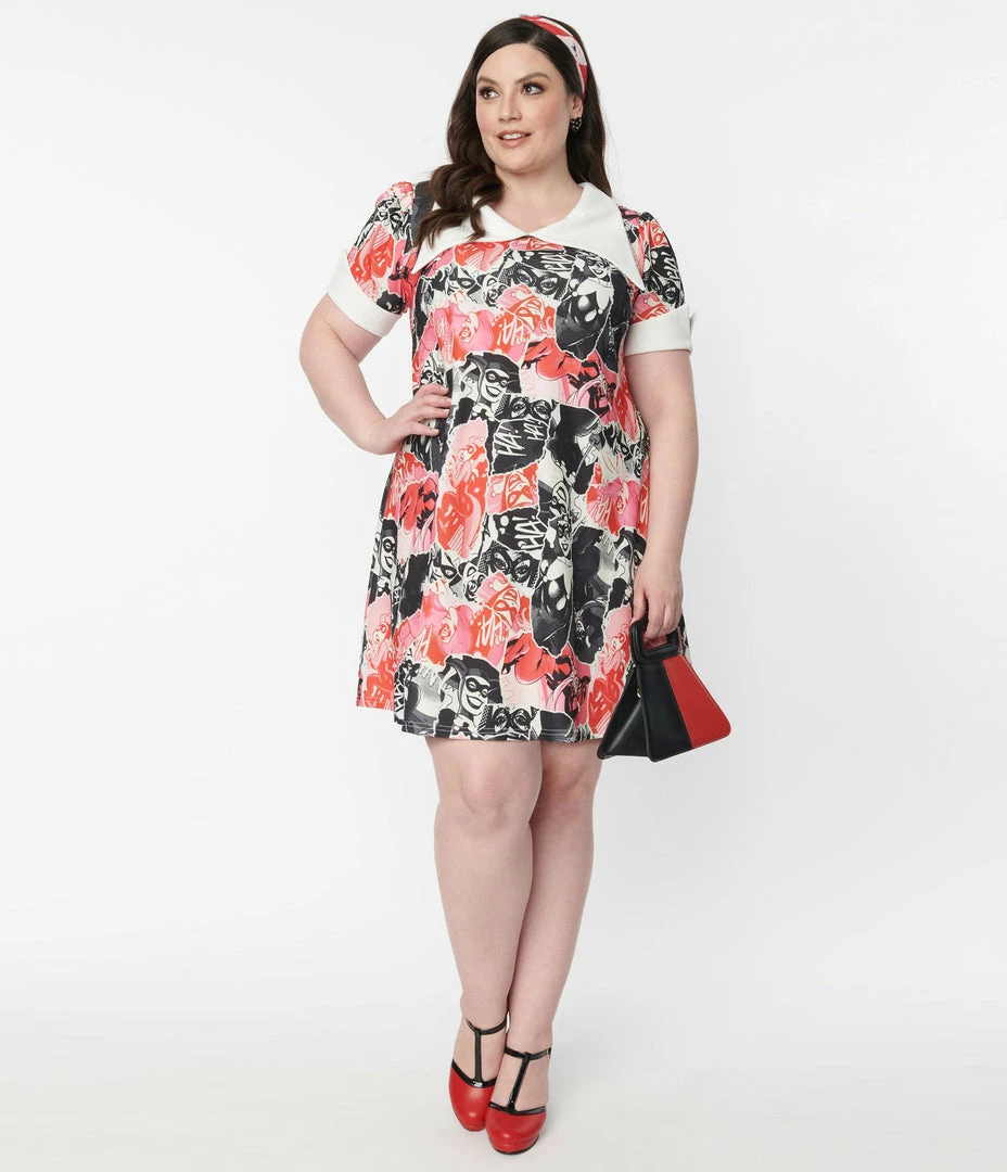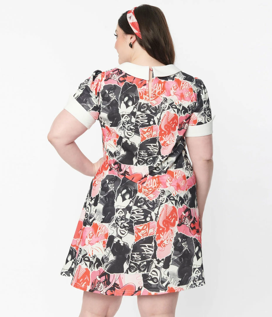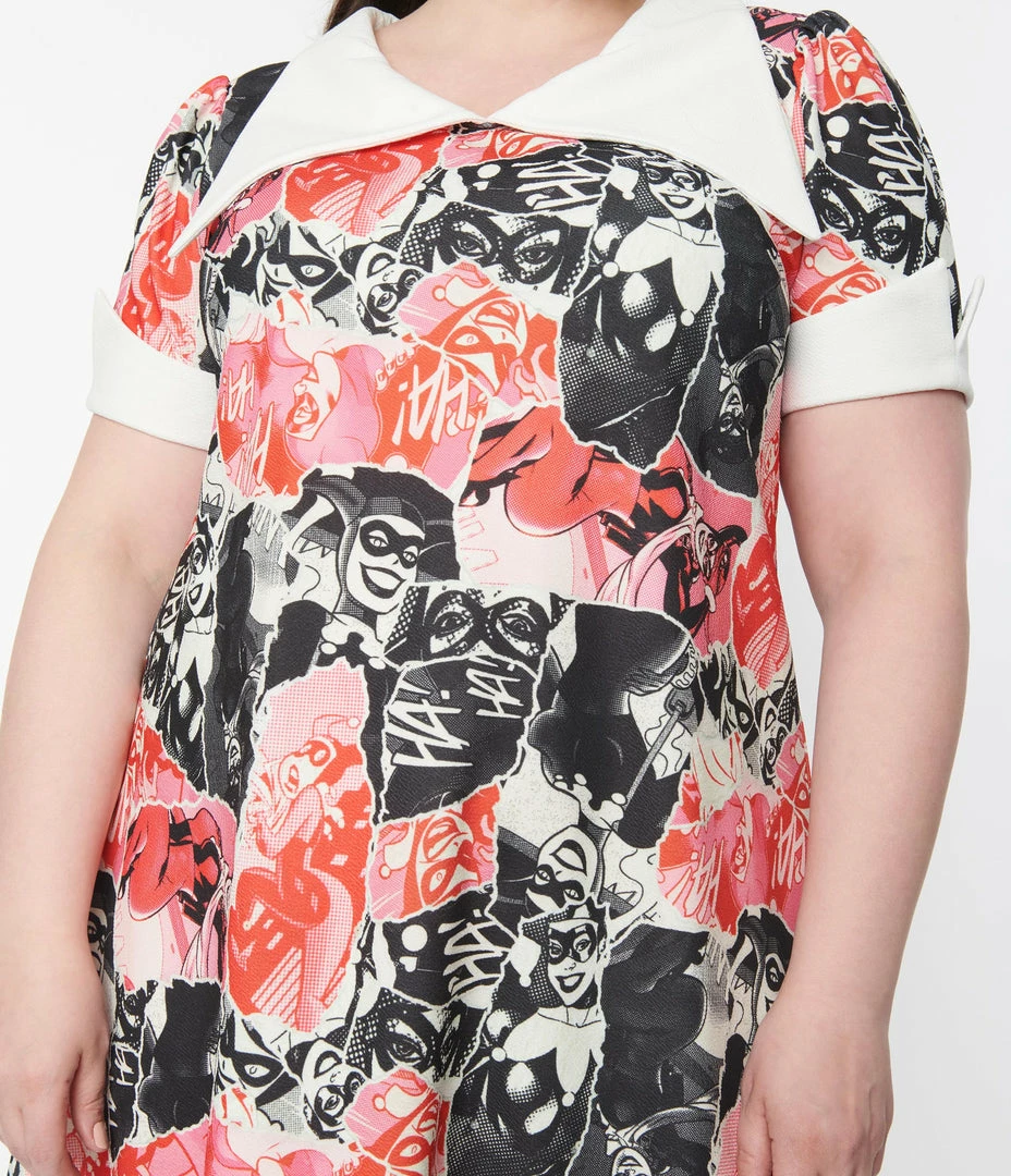 This sassy plus size mini dress is a sensational collaboration with DC Comicโs Harley Quinn, boasting a pink, black, and white comic collage print throughout the textured woven fabric. Outfitted with a solid white collar, secured in the back with a button keyhole, and framed by short sleeves.