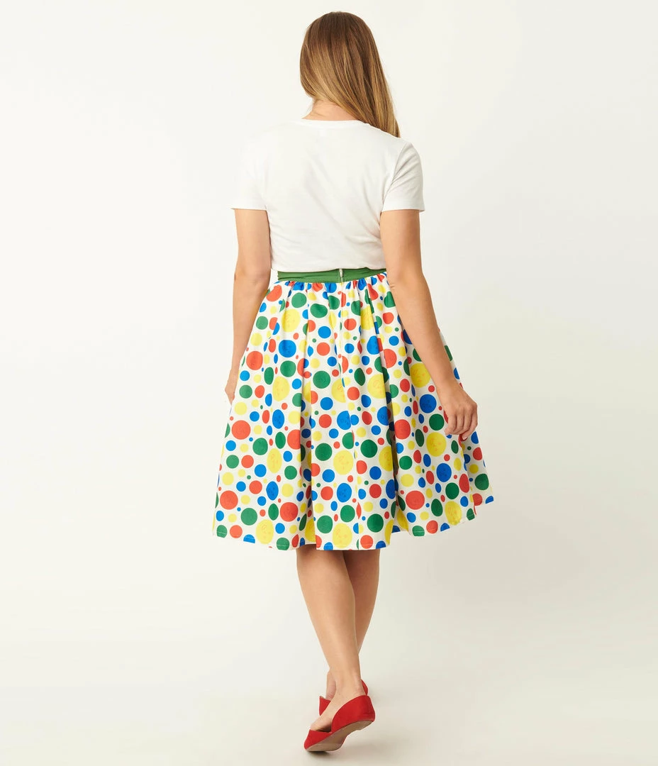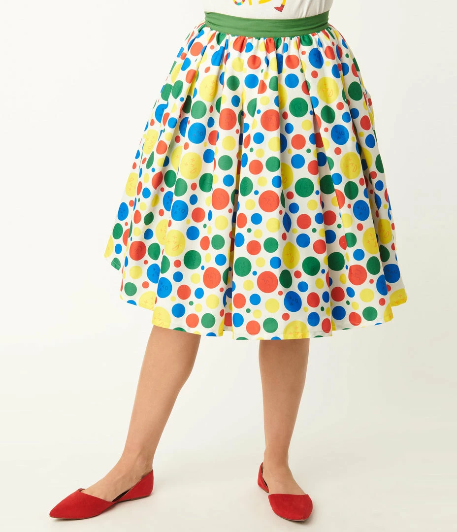 Spin the wheel, darling! Tie them up in knots with this playful swing skirt from Unique Vintage, a sweet homage to Hasbroโs moving game Twister. This mid-century inspired piece is crafted in a smooth woven blend that portrays the famous multicolor polka dot pattern. The banded waist is cinched with a back zipper while sweet knife pleats and side pockets provide modern function and form as you make them fall!