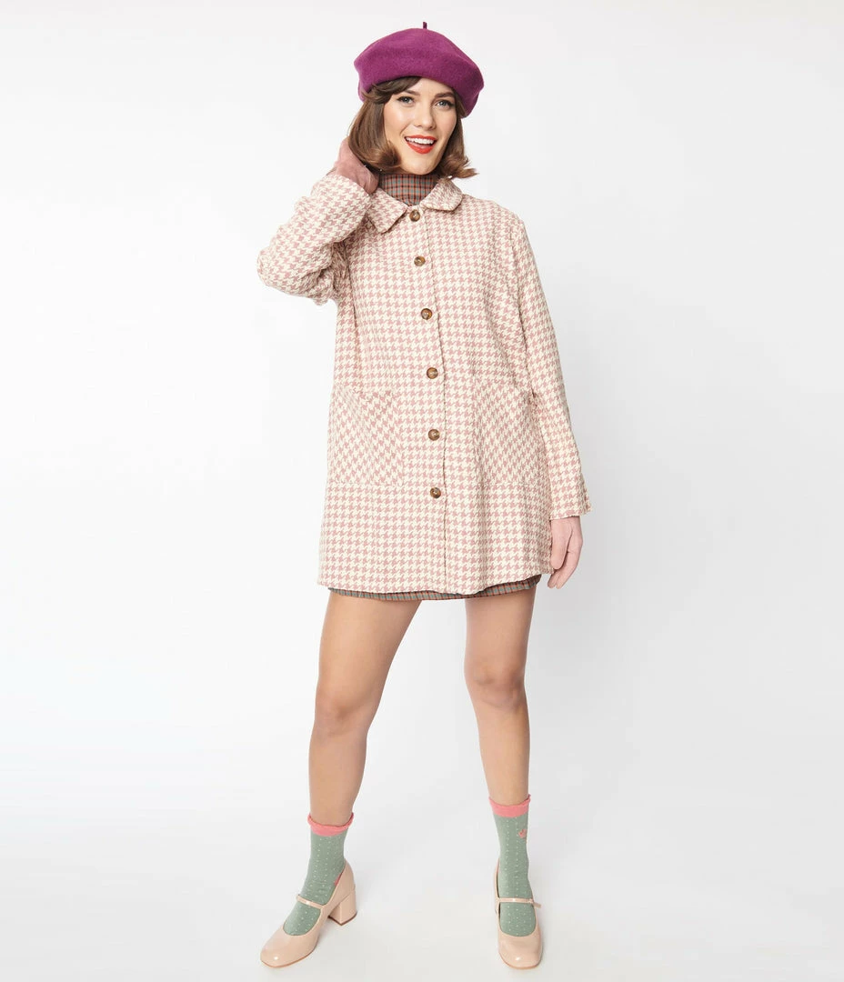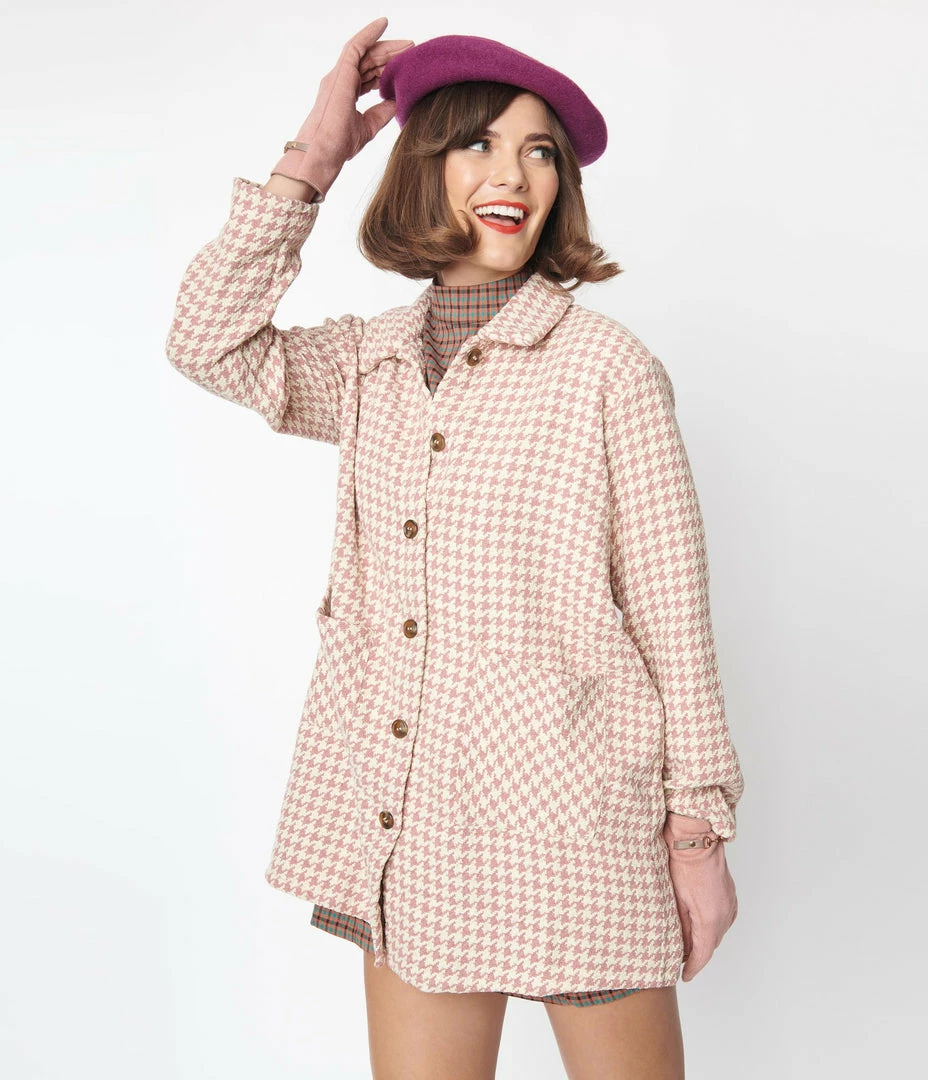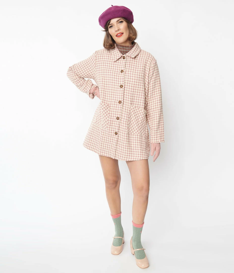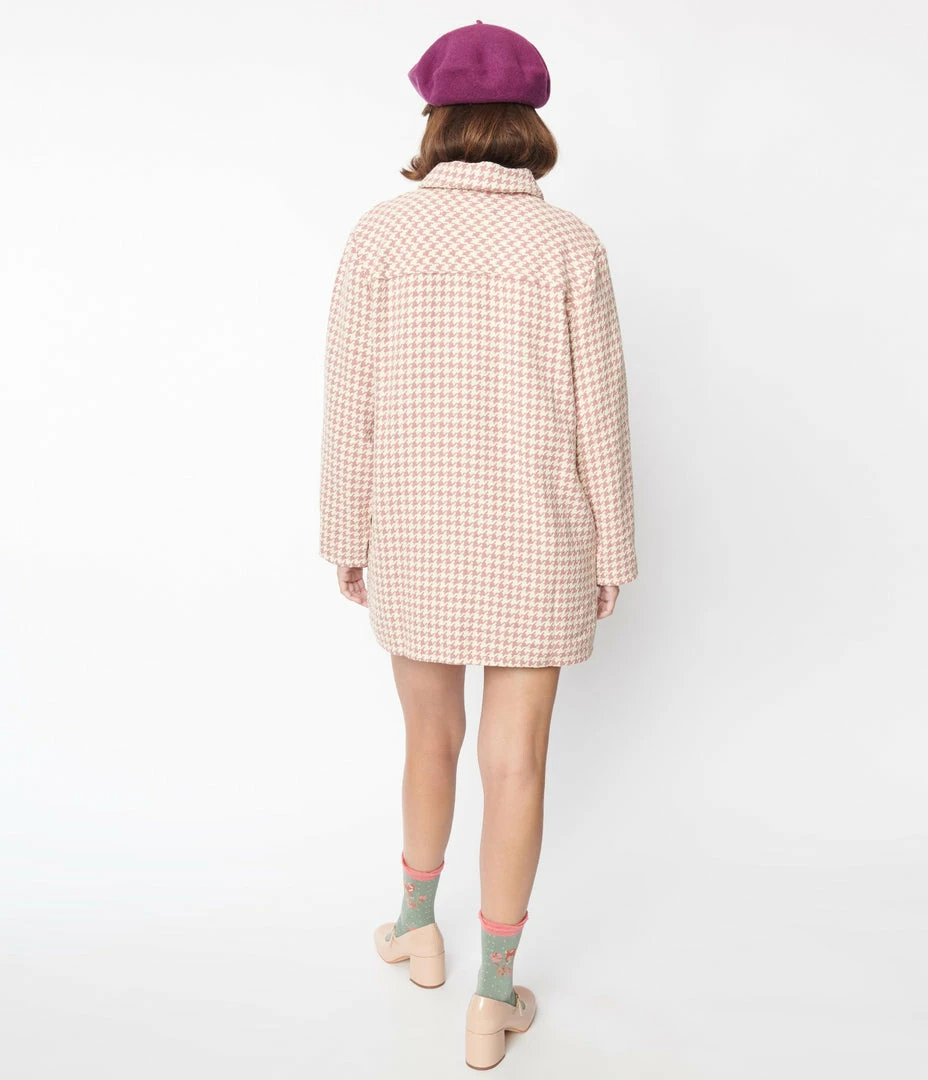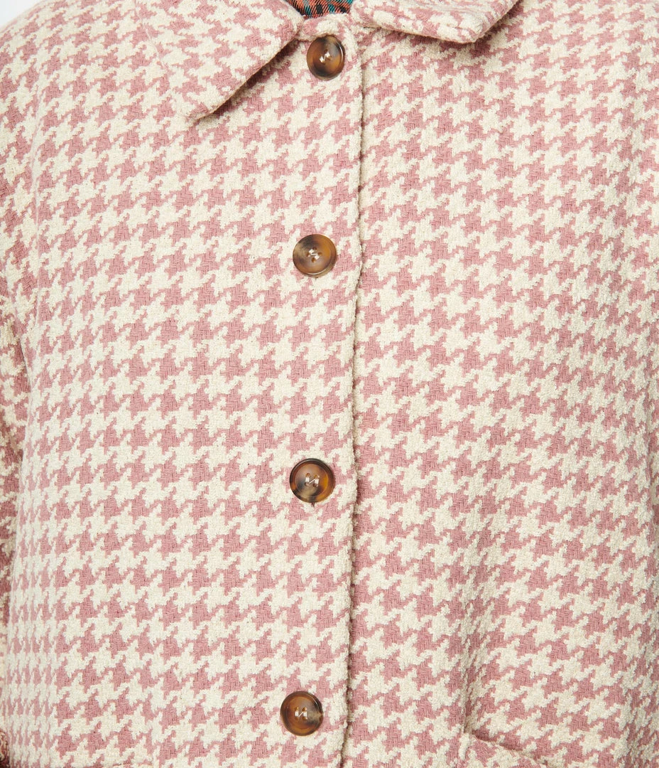 Stay sweet and sophisticated, darlings! Crafted with a pink and cream wool-blend houndstooth pattern throughout the relaxed silhouette. Complete with a button up front and front pockets for ease.