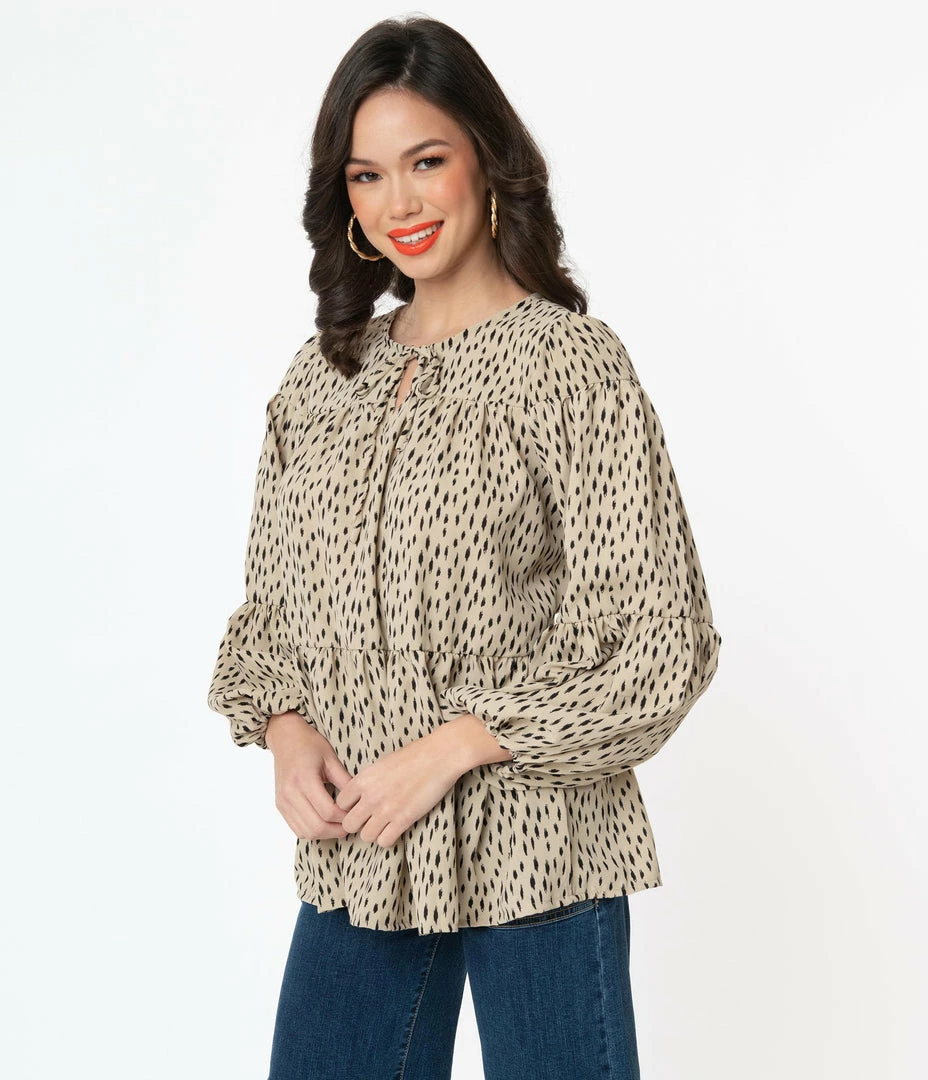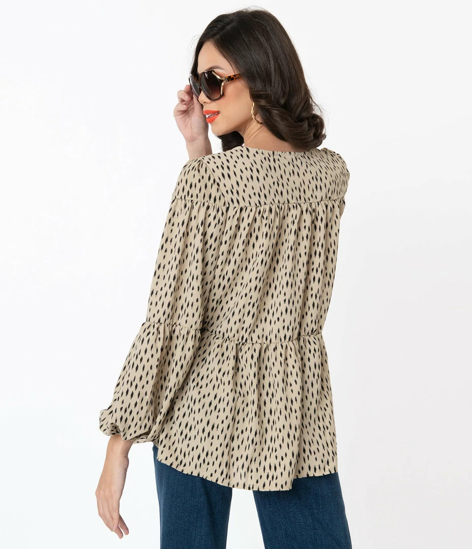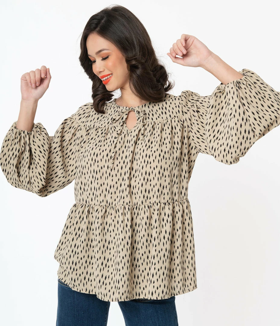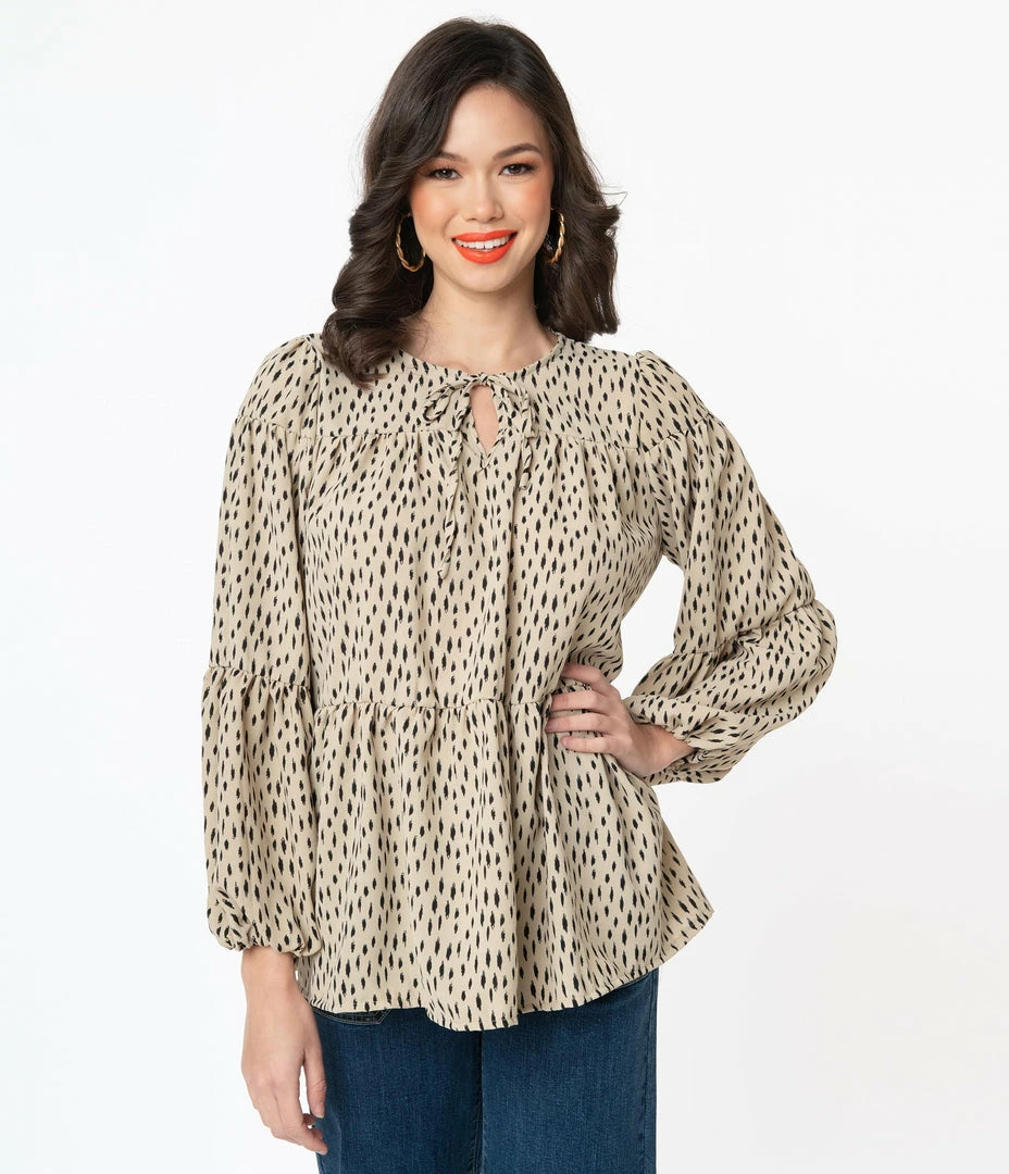 Freshly vintage, dames! This breezy blouse is crafted in a lightweight woven fabric that features a black spotted print throughout the taupe tan backdrop. The modest neckline is centered by a self tie keyhole while the long sleeves drop into an elastic cuff. The casual design drops into a peplum flounce for feminine flirtation!