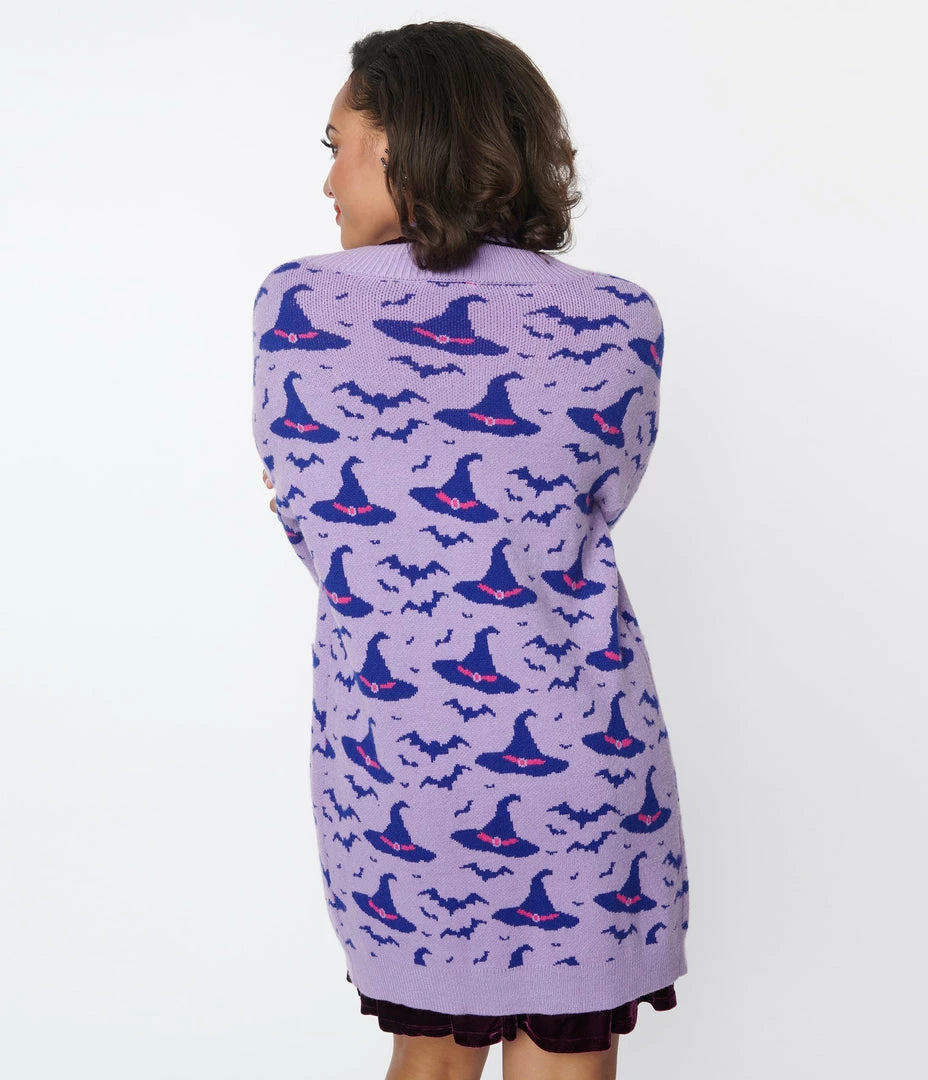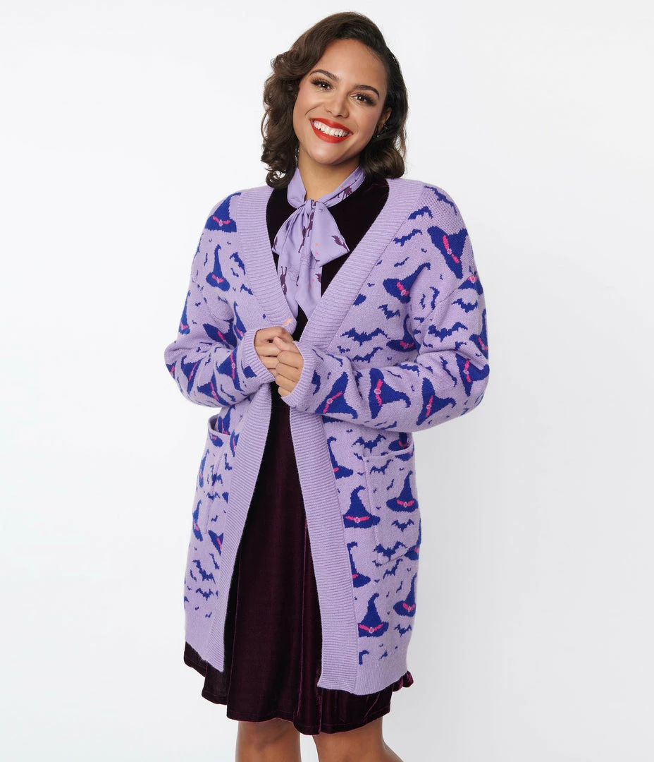 This cozy cardigan is chilling in a light purple knit that dances with dark purple witches hats. The ribbed open front is framed by fitted long sleeves and outfitted with side pockets!