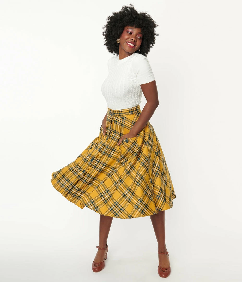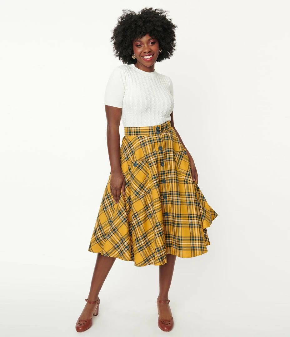 Nothing can stop you now, doll! A vintage inspired swing skirt from Hell Bunny, this sweet separate is cast in a gorgeous mustard yellow and navy plaid. Crafted in a soft woven fabric, the banded high waist is nipped in with front buttons lending retro embellishment. Outfitted with front patch pockets for a modern touch!
