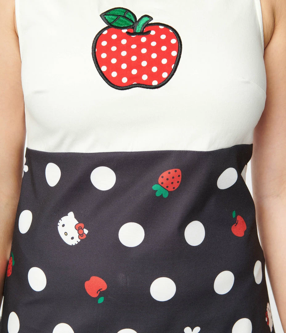 A sweet retro inspired shift dress in collaboration with Hello Kitty cast in a white bodice with a charming applique apple and black A-line skirt boasting white polka dots, apples, strawberries, and Kittyโs face.Perfectly structured with bust darts, a scoop neck, and a back zipper.