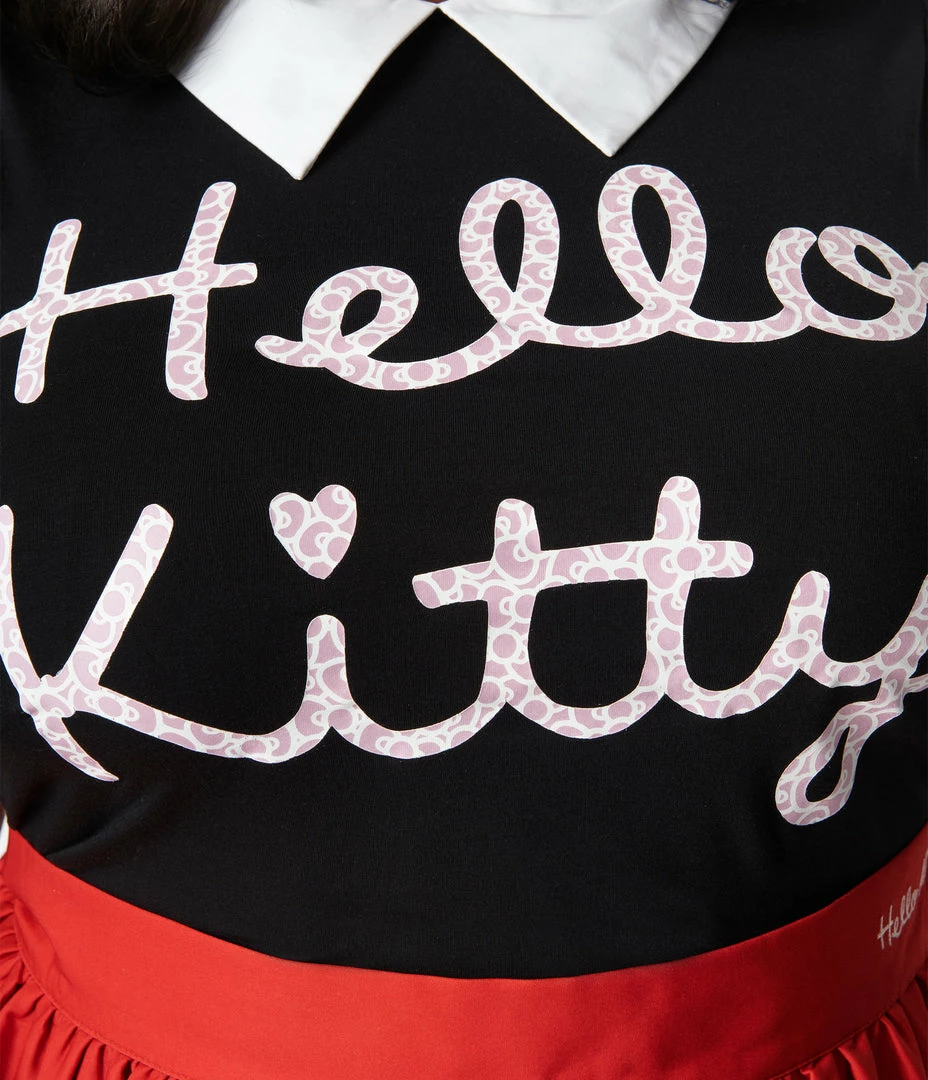 This adorable plus size top, in collaboration with Hello Kitty, is crafted in a black soft knit fabric that dances with the Hello Kitty signature in a light pink and white bow pattern. Accented with a white collar, secured by a back button keyhole, and complete with short sleeves and a cropped hemline.