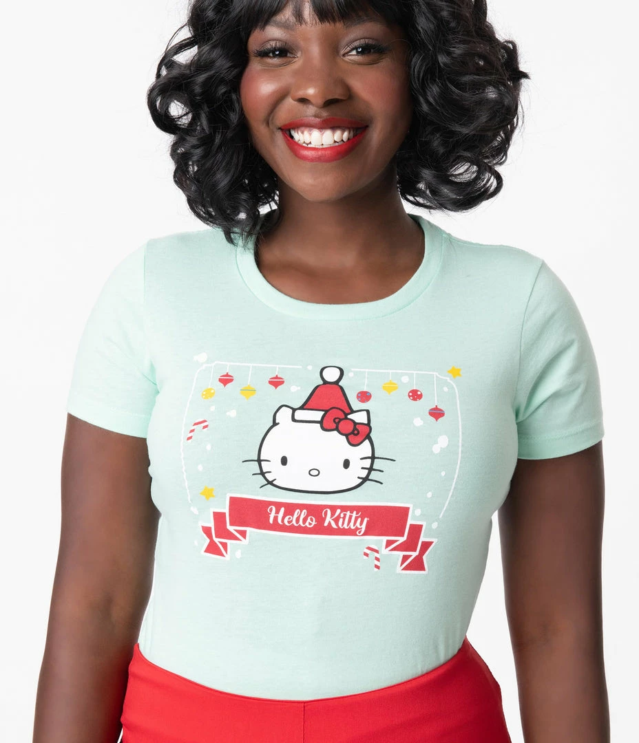 Something merry is about to happen, darling! This adorable women’s tee from Unique Vintage is a cute collaboration with Hello Kitty. Crafted in lightweight mint cotton, this fitted separate features a graphic print of Hello Kitty in her darling Santa hat and red bow with retro ornaments hanging nearby. Complete with a crew neckline and short sleeves, kindness is the best gift!