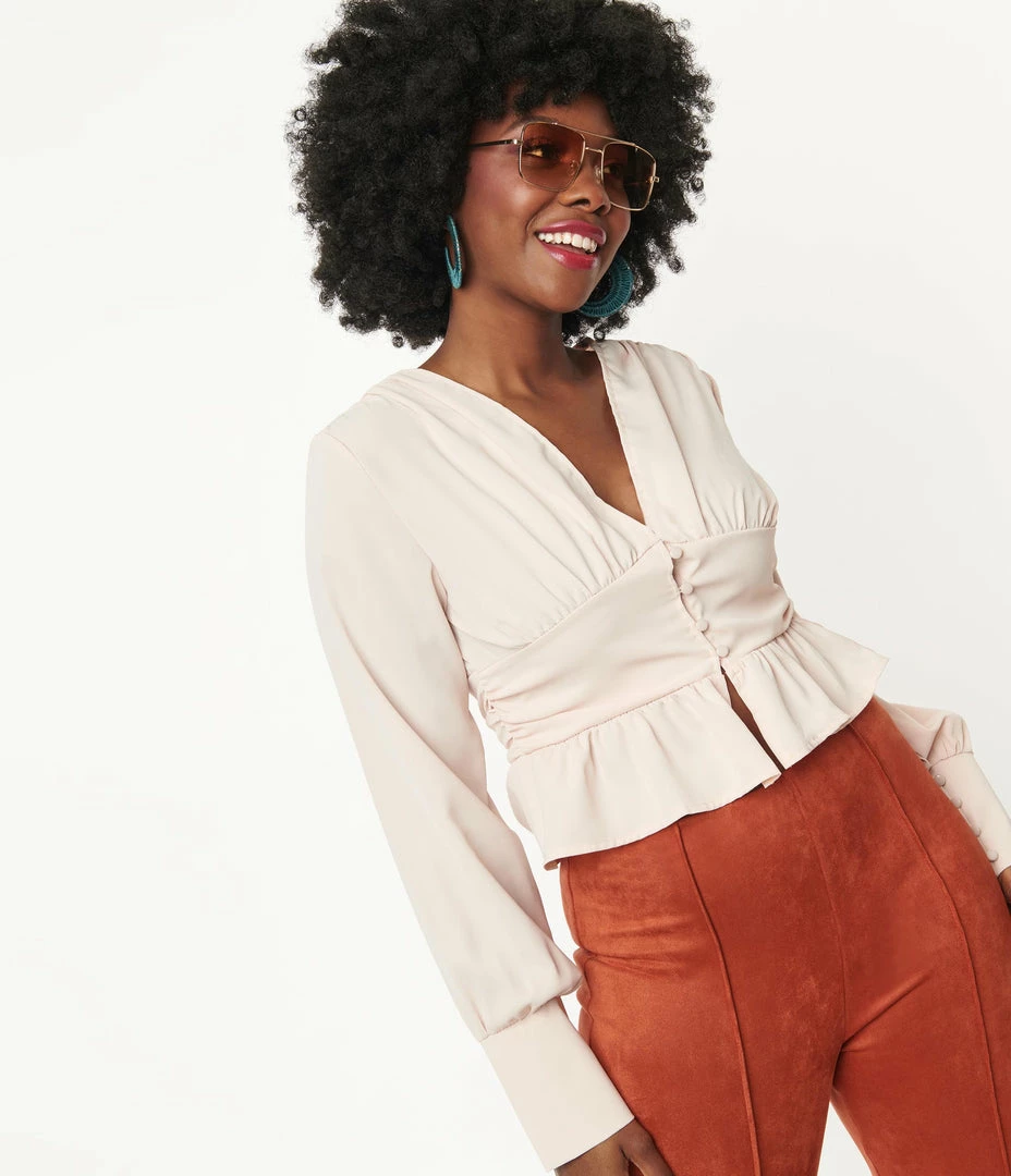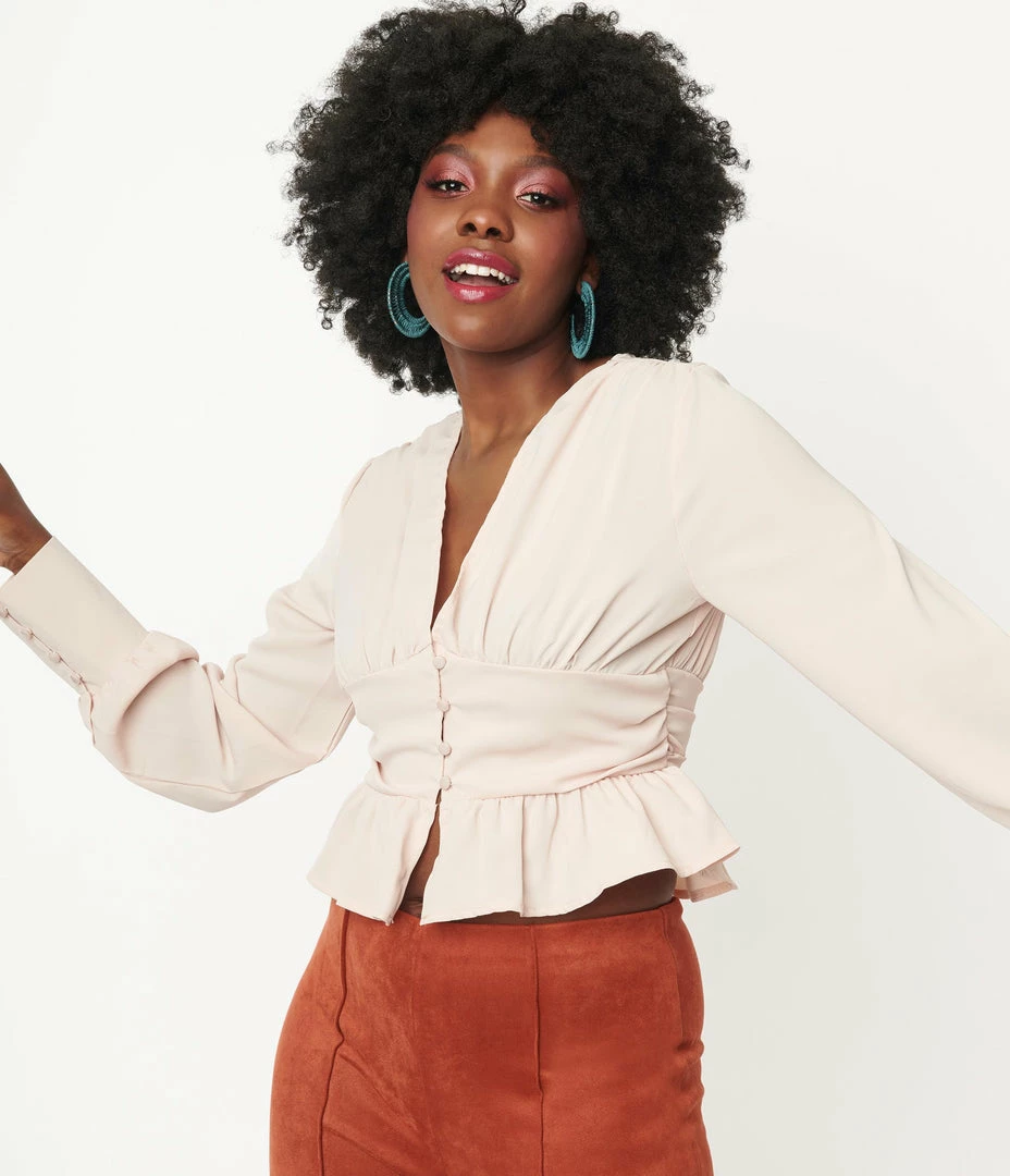 All eyes are on you, darling! This chic vintage inspired blouse is crafted in a gorgeous beige woven fabric. Boasting a sultry corset design the wide banded empire waist is cinched with buttons leading to the V-neckline, and framed by billowing long sleeves secured with buttons. The crop length is accented by the ruffled peplum perfect for pairing with your favorite high waisted pants or skirts!