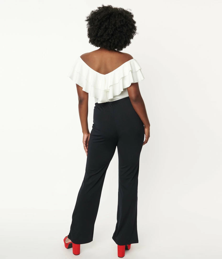 Nothing can stop you now! The retro style separates are crafted in a fabulous black stretch cotton blend and boast a fabulous high waist silhouette accented with faux button tabs and gold buttons. The wide legs drop to your feet while the banded waist is cinched with elastic!